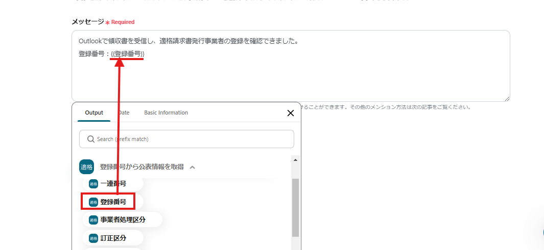 続いて、「登録番号から公表情報を取得」を押してアクションを設定します。