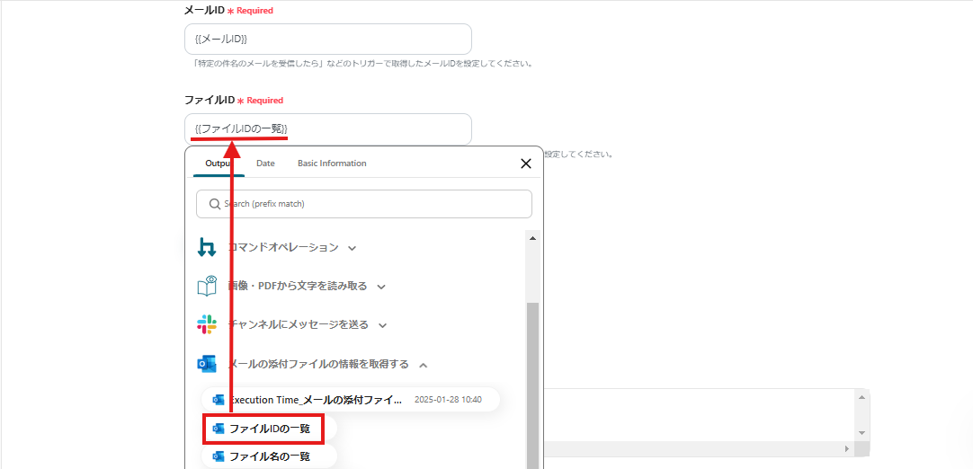 ファイルIDは「メールの添付ファイルの情報を取得する」というタブから設定してください。