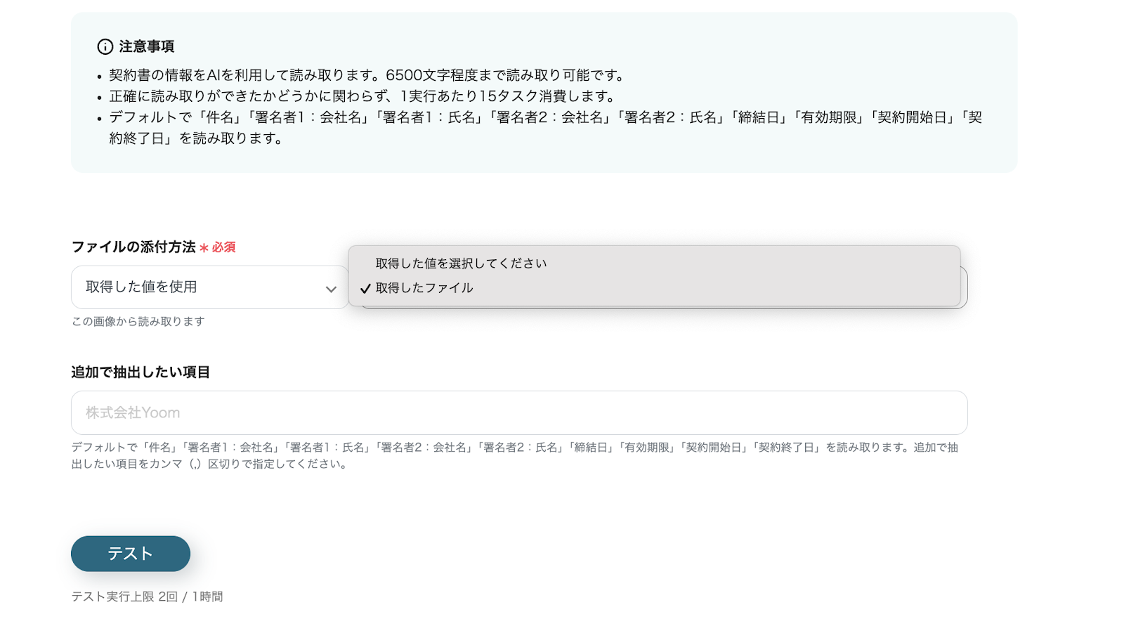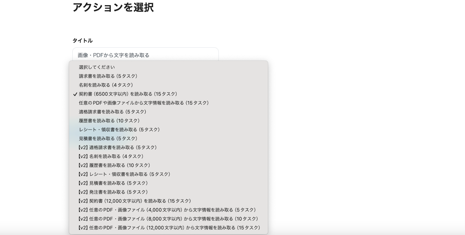 (2)次の画面で、画像・PDFから文字を読み取るアクションをプルダウンから選択します。 アクションは複数あり、選択するアクションによって消費されるタスク数が異なるのでご注意ください。 今回は『契約書(6500文字以内)を読み取る(15タスク)』を選択します。