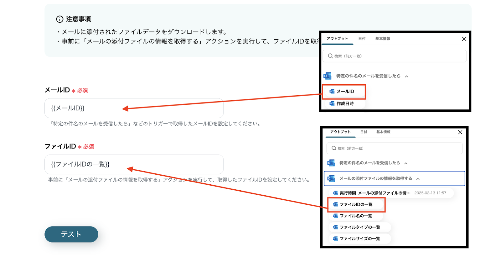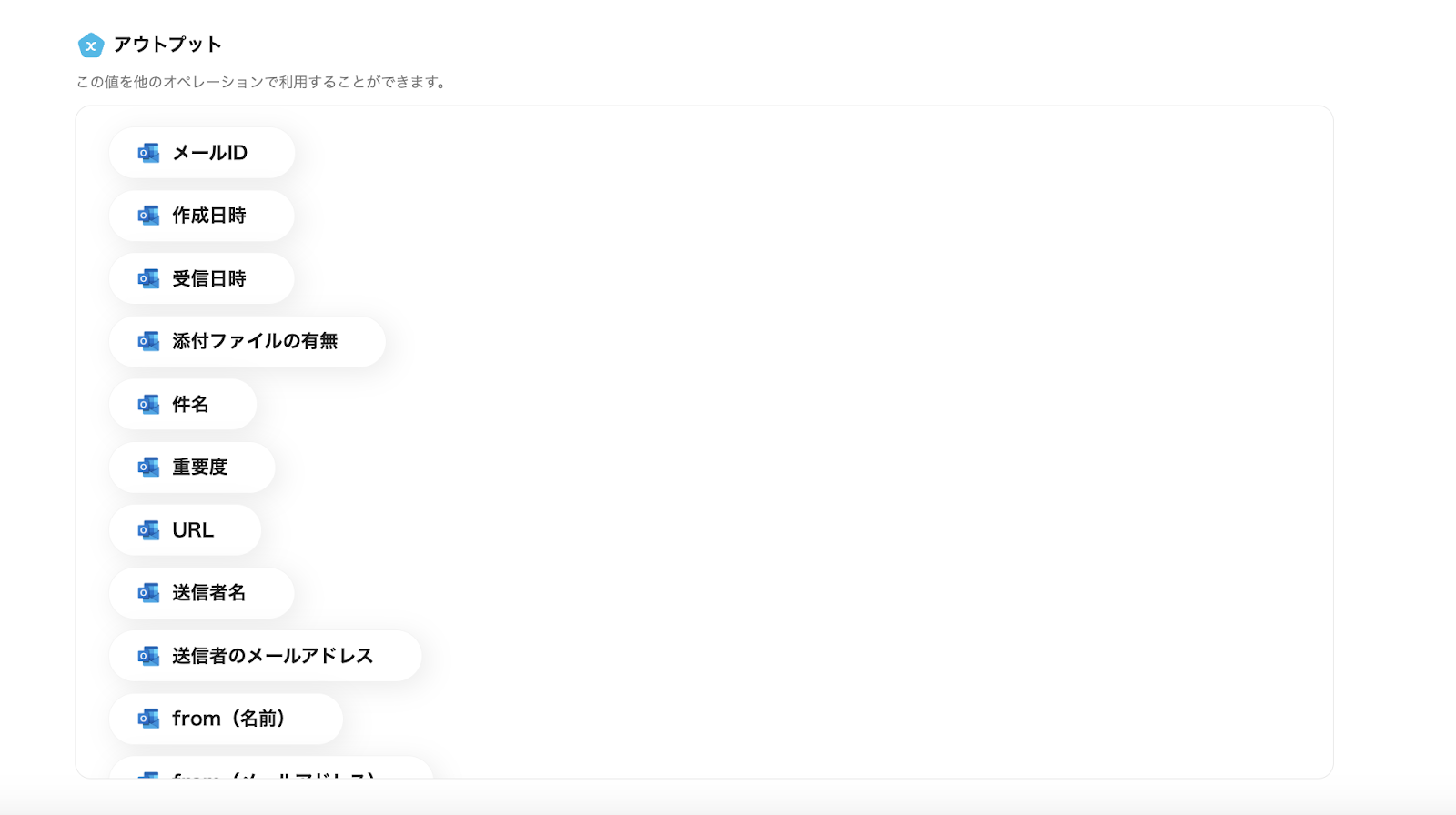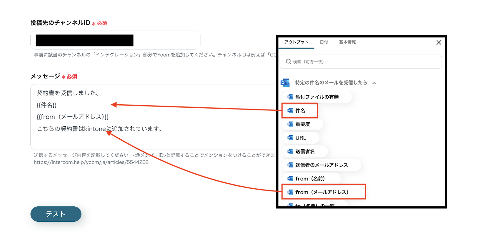 (6)「キーワード」にも情報を入力した後、[テスト]をクリックし、問題がなければ[保存する]をクリックします。 このステップで下記のような情報をアウトプットとして取得することが可能です。 アウトプット情報は、「この値を他のオペレーションで利用することができます。」という注釈の通り、この後のステップで引用・活用できます。
