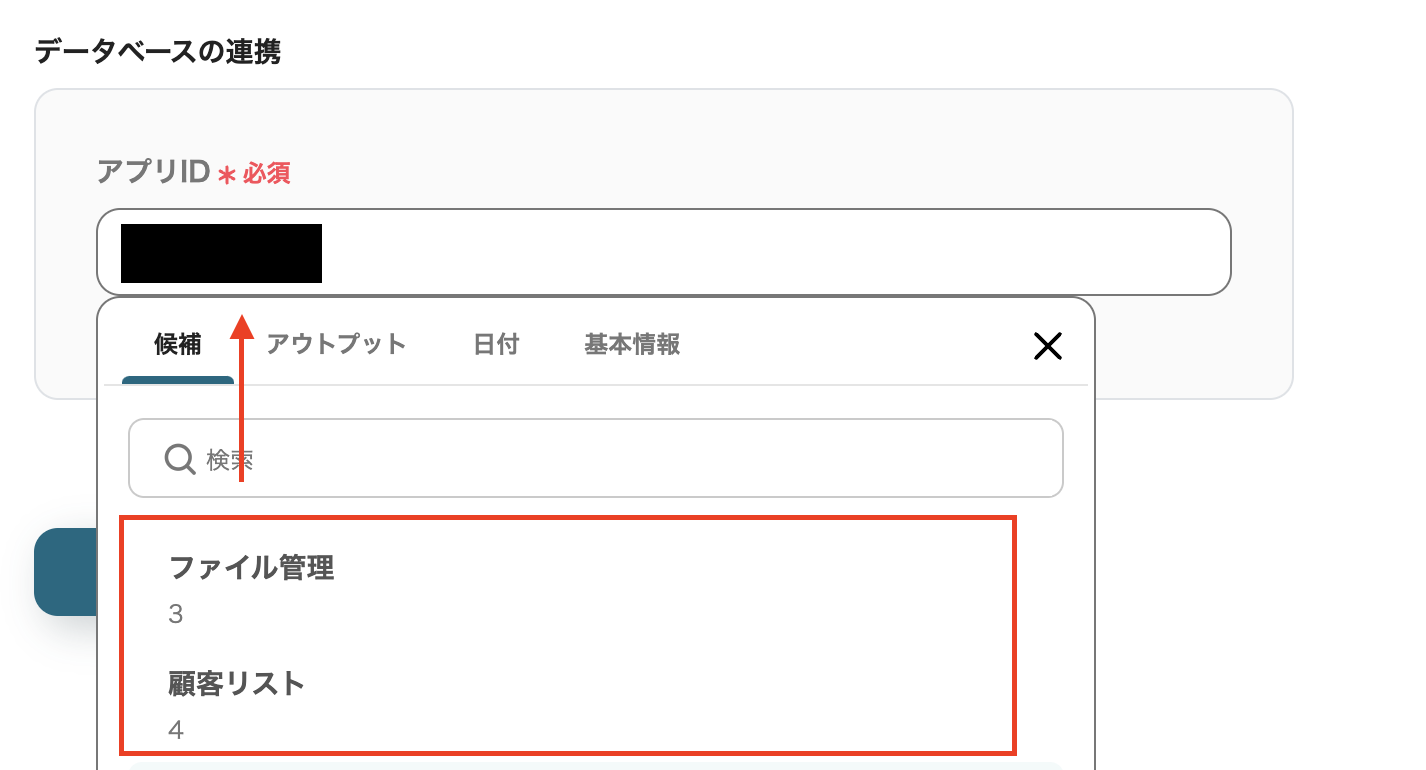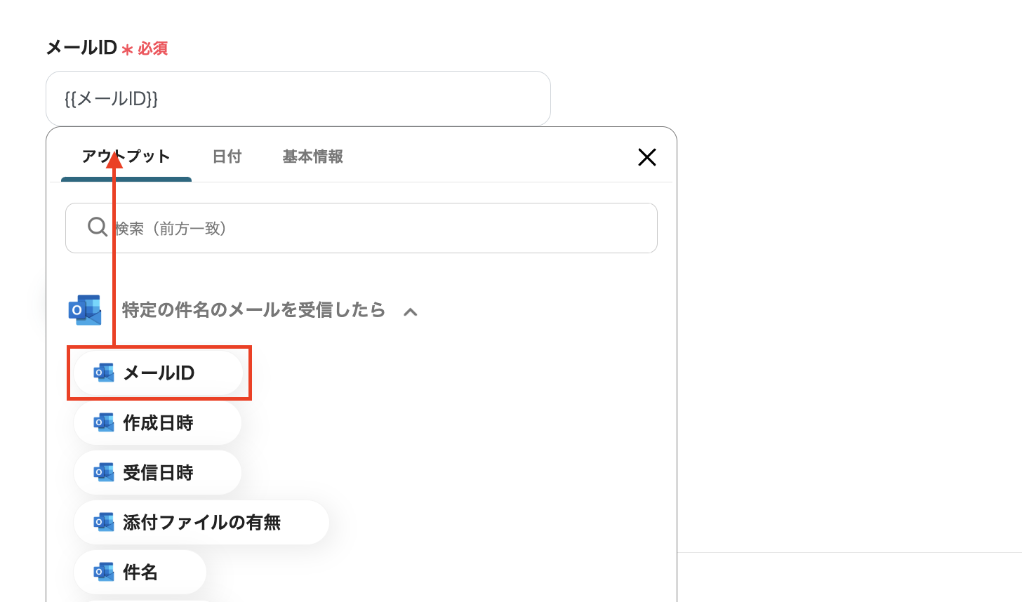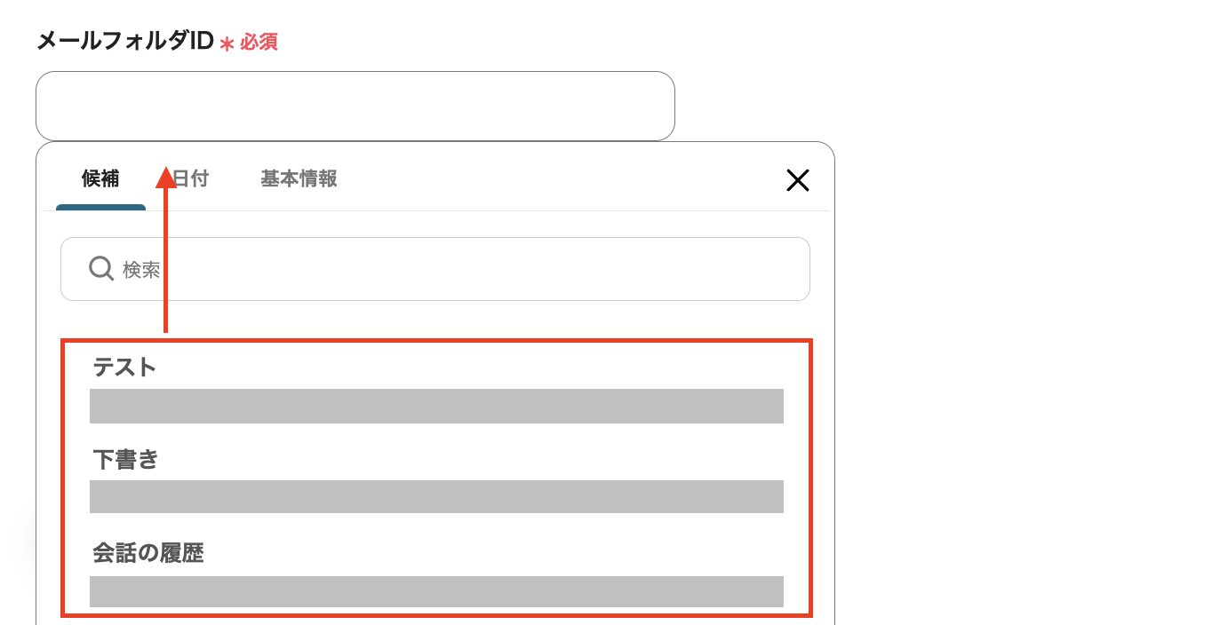 (5)「メールフォルダID」は入力バーをクリックすると、連携したアカウントに基づいた内容が『候補』に表示されるので、運用に沿った情報を選択できます。