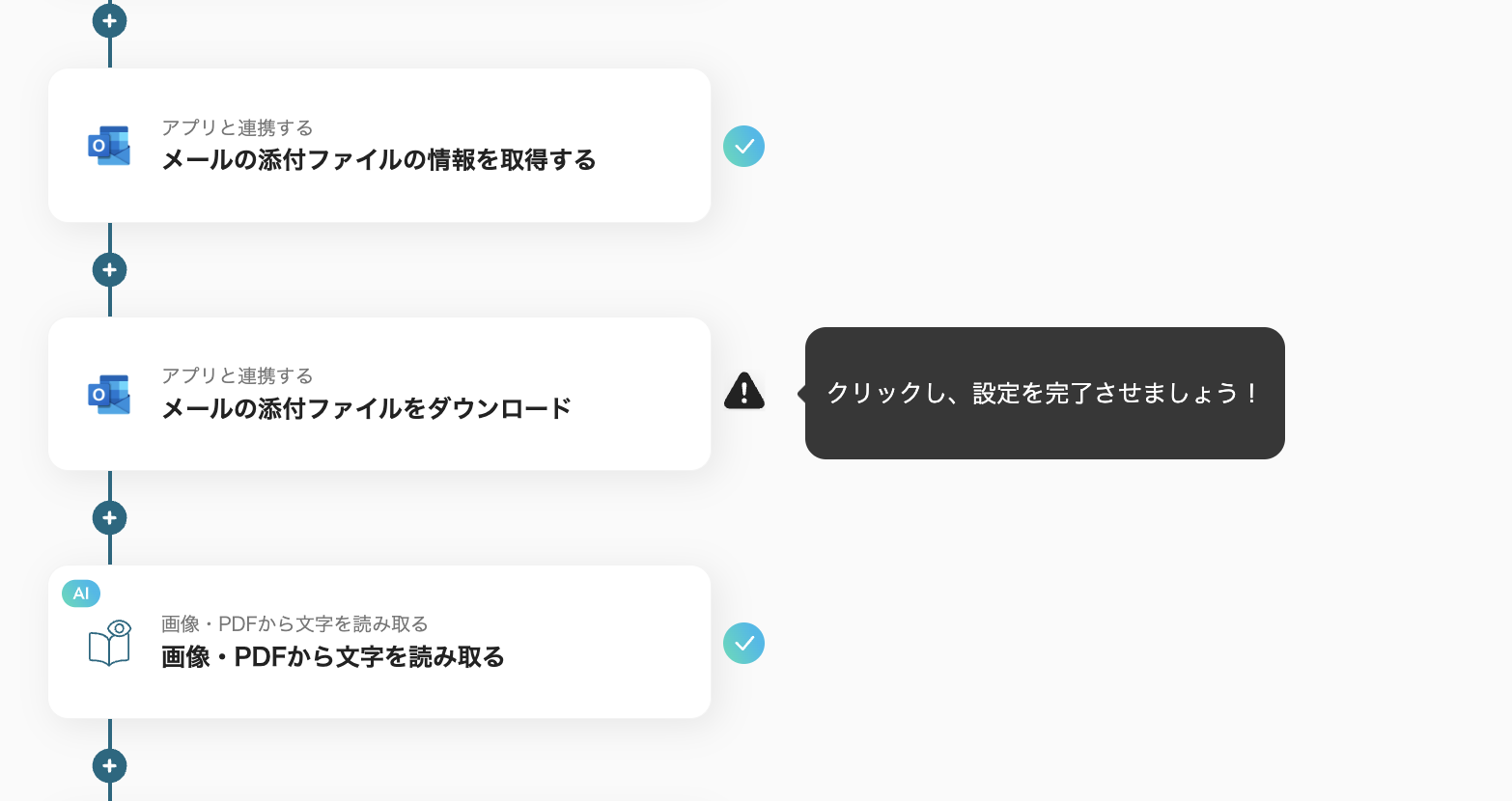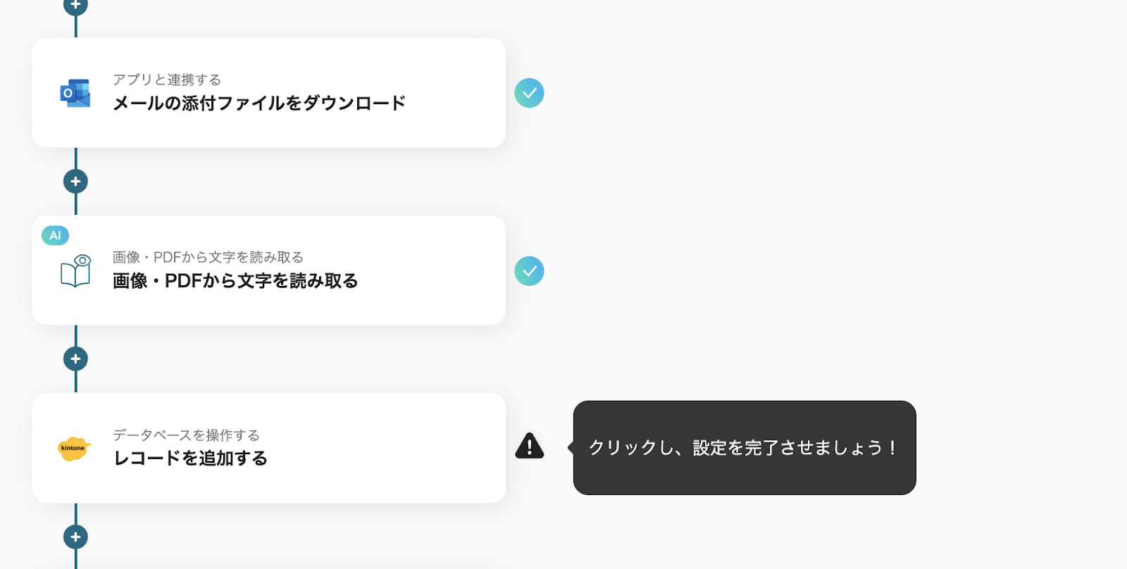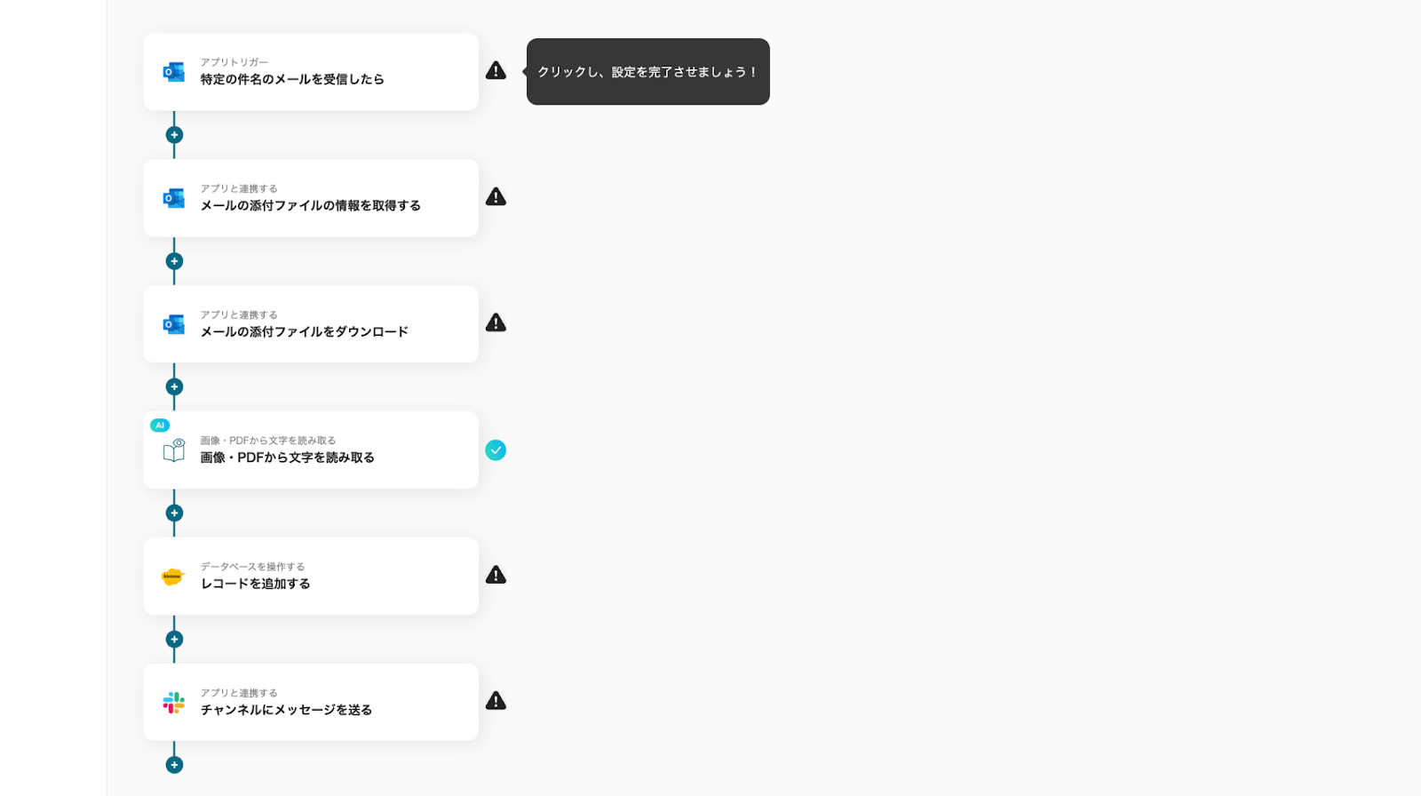 Outlookの起動設定とAI OCR(画像読み取り)の設定、続くkintoneへ書類データを追加する設定と通知するSlackの各オペレーションの設定