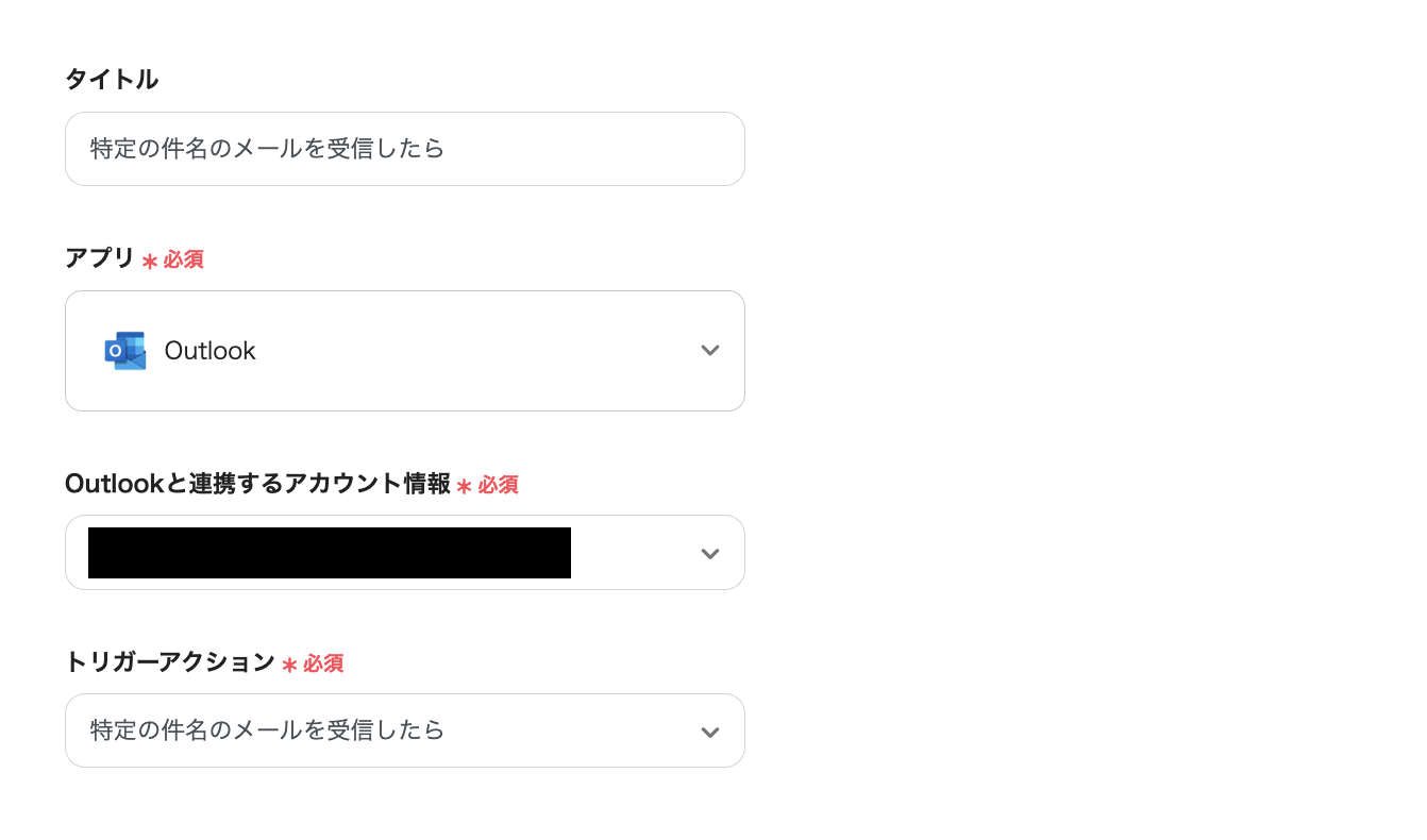 (2)1つ目のステップ「特定の件名のメールを受信したら」をクリックしてください。 (3)連携するアカウント情報を入力し、[次へ]をクリックします。