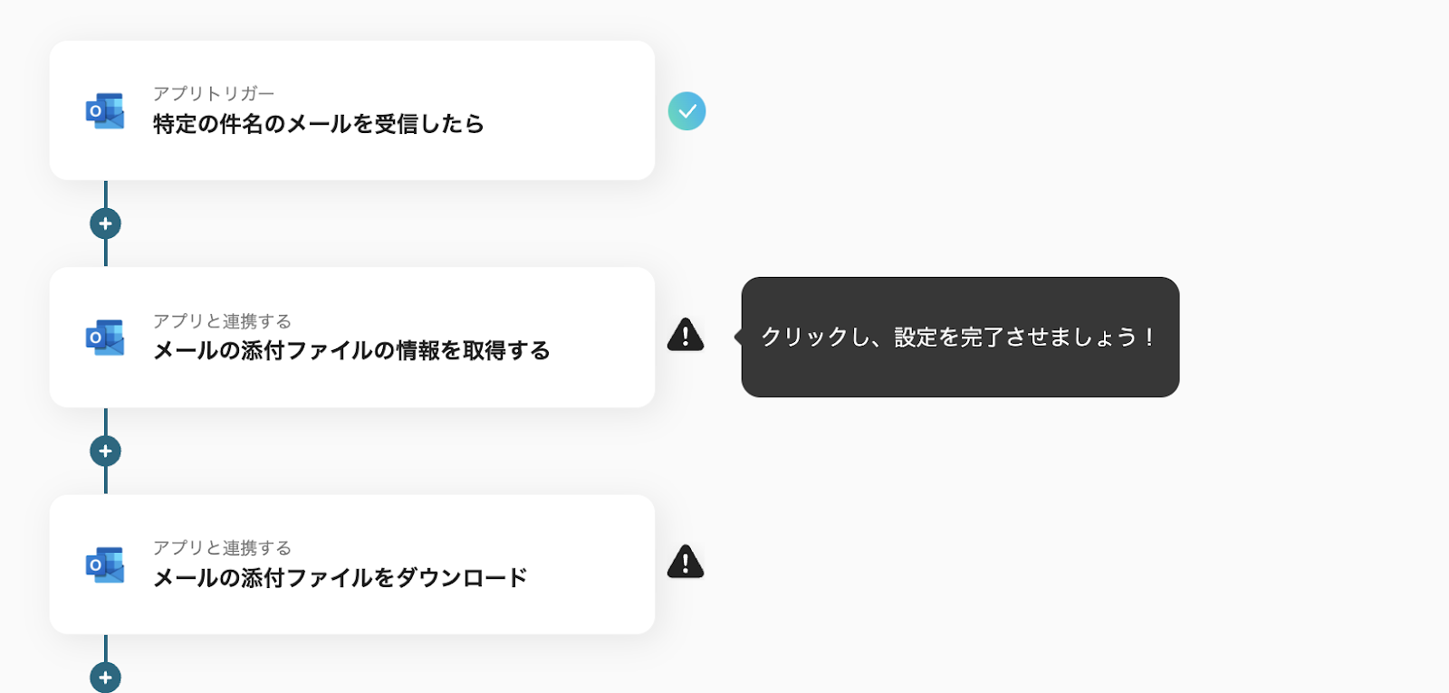 (1)次に、2つ目のステップ「メールの添付ファイルの情報を取得する」をクリックしてください。
