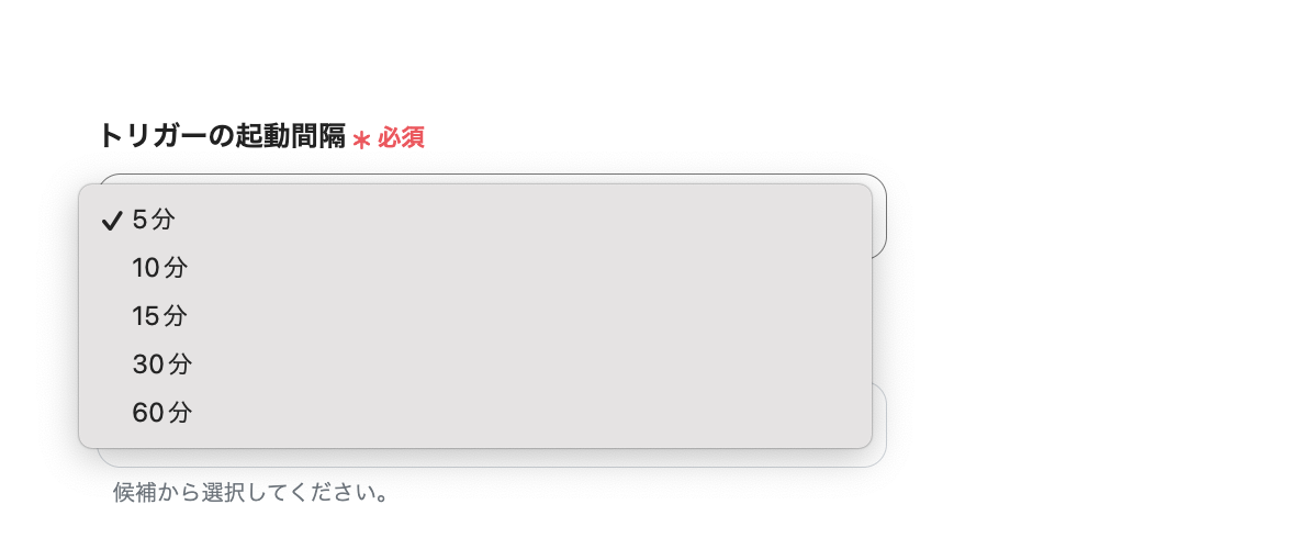 (4)次の画面で設定する「トリガーの起動間隔」は5分、10分、15分、30分、60分から任意のものを選択してください。 ※トリガーの起動間隔はプランによって異なるため、注意が必要です。
