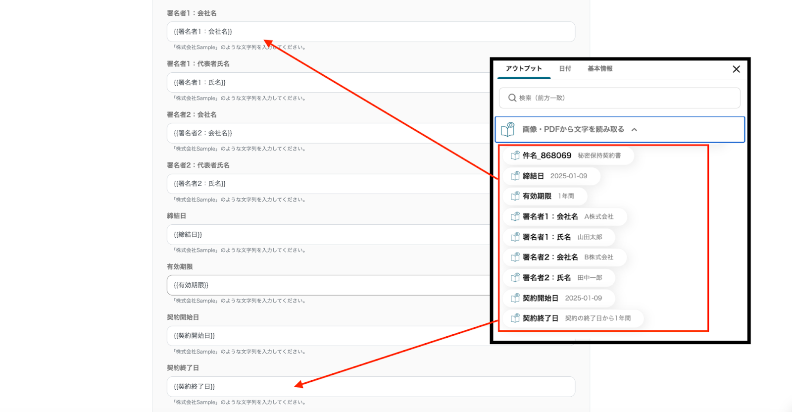 Gmailのトリガー設定では、「契約書」など特定のラベルが付いたメールのみを対象にするなど、自動化を開始する条件を任意で設定できます。 OCR機能では、契約書の中から読み取りたい項目(例:会社名、契約日、金額など)を自由に指定することが可能です。 Google スプレッドシートへのアウトプット設定では、情報を追加したいスプレッドシートのIDや、書き込みを行うシート、セルの範囲を任意で指定できます。 ■注意事項