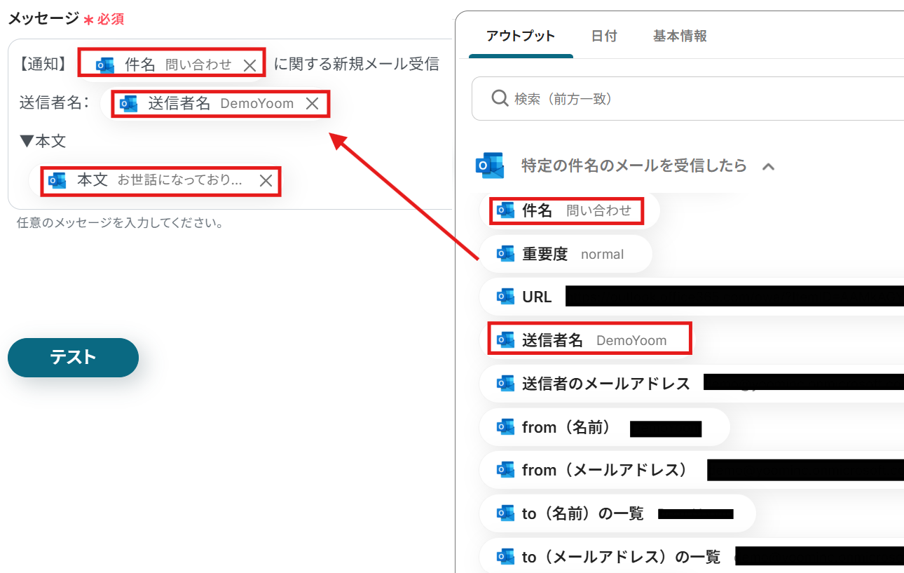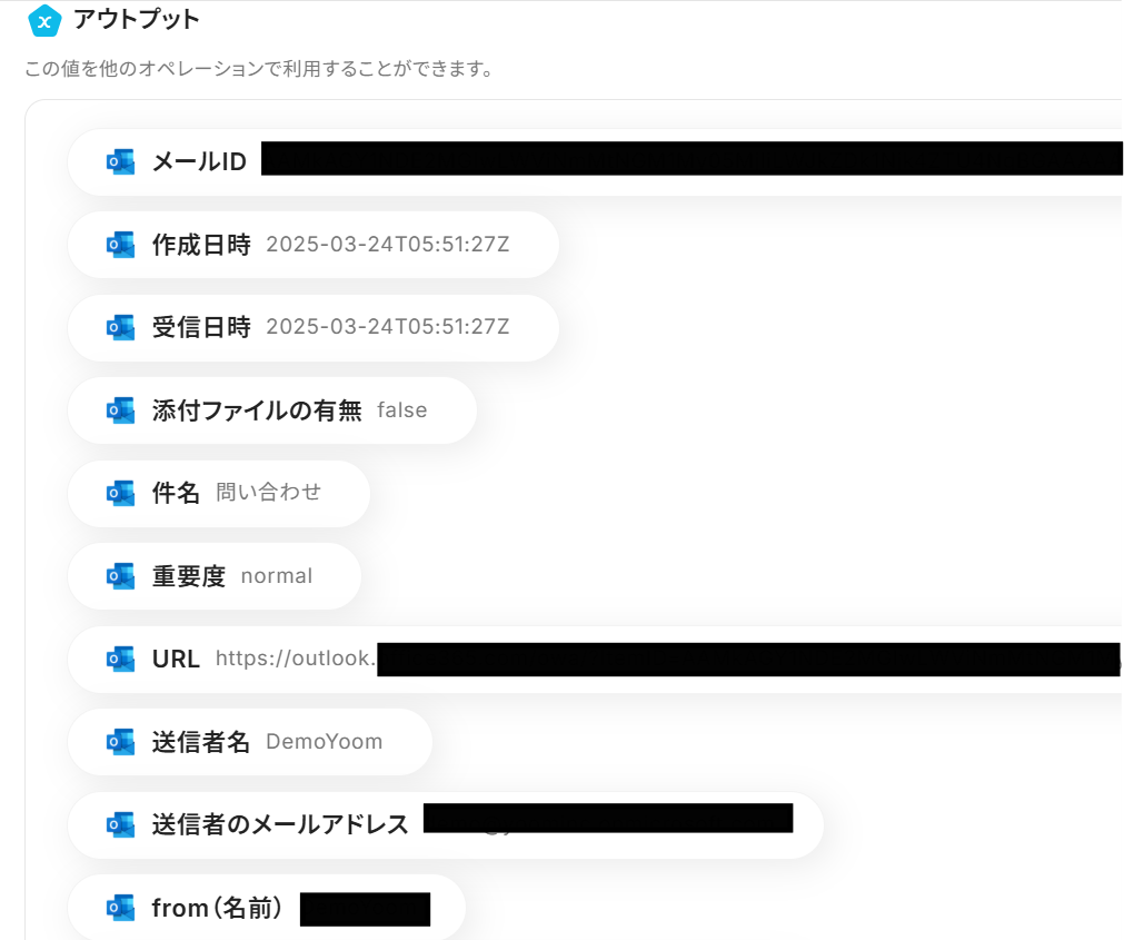 このアウトプットをこのあとのアクション設定時に引用することで、OutlookとLINE公式アカウントのデータ連携を実現していきます!