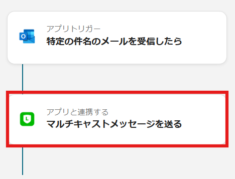 続いて、Outlookで受信したメール情報を用いて、LINE公式アカウントにメッセージを送る設定を行うため、「マルチキャストメッセージを送る」をクリックします。