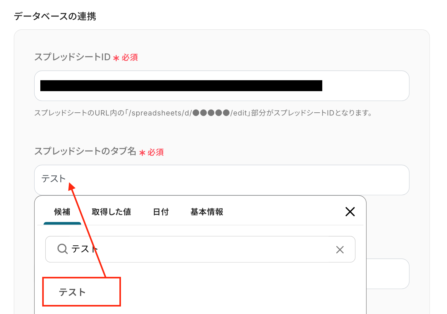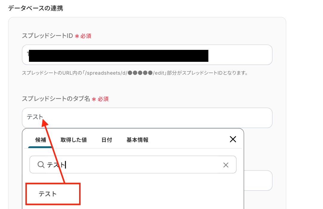 「スプレッドシートID」や「タブ名」は入力欄をクリックして表示される候補から選択することも可能です。