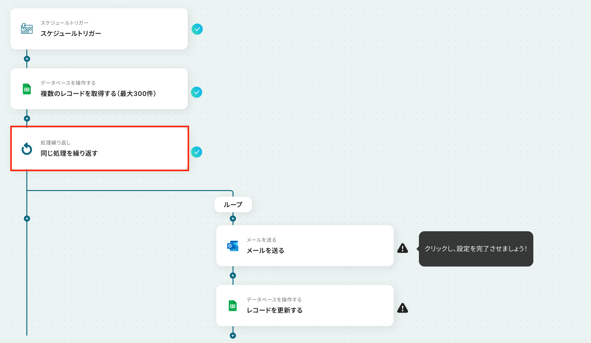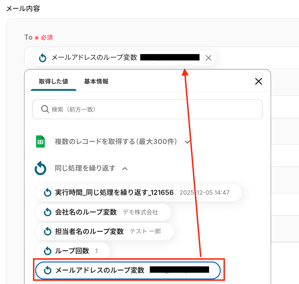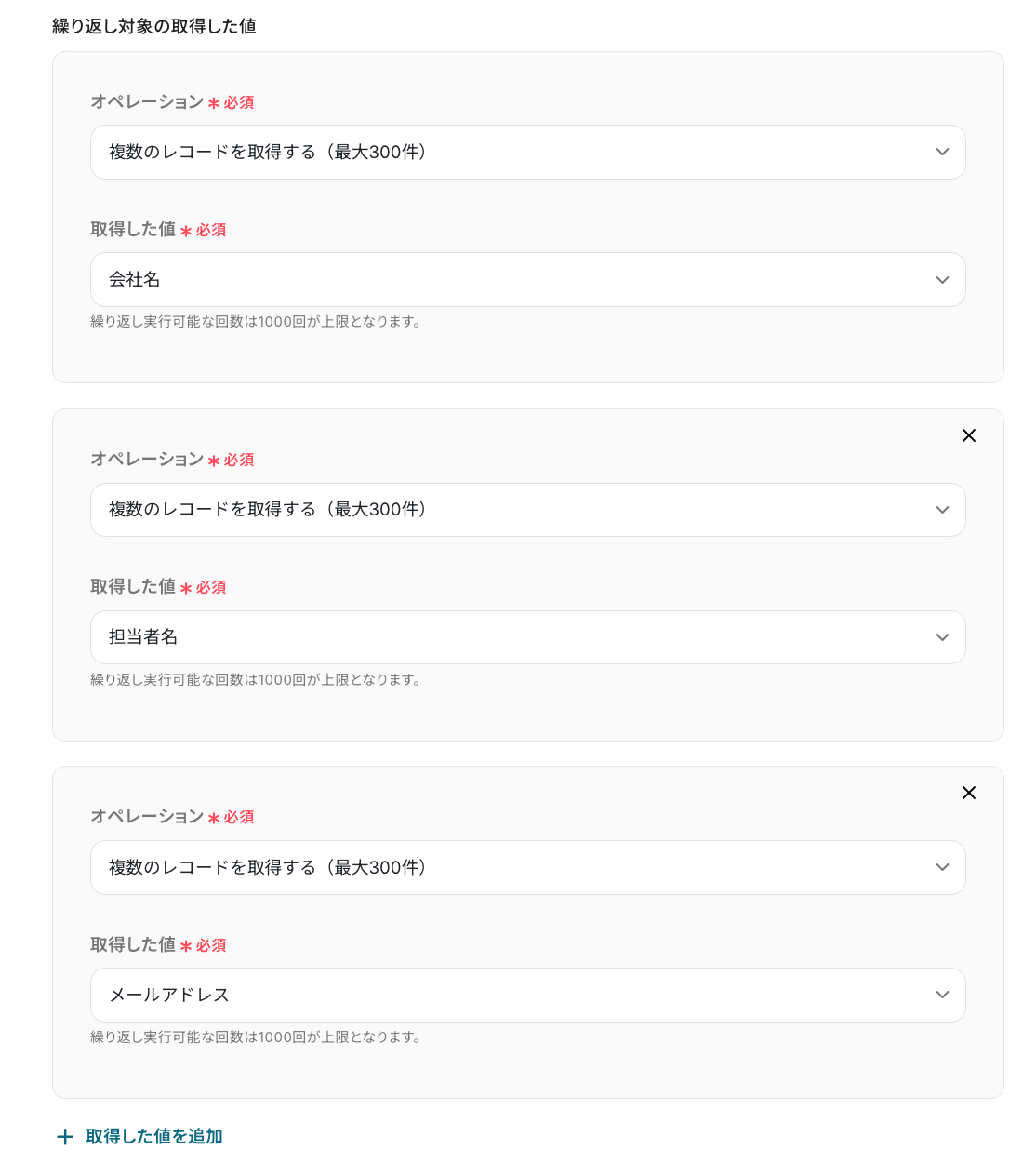 次の画面で、繰り返し対象を指定していきます!「オペレーション」 は、「複数のレコードを取得(最大300件)」を選択してください。「取得した値」 は、先ほどのステップで取得した「会社名」・「担当者名」・「メールアドレス」を設定しましょう! 最後に「完了」をクリックして、次のステップに進んでください。