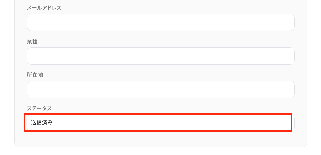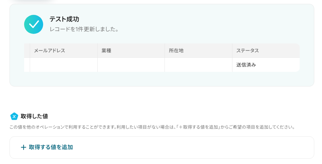続いて、「更新後のレコードの値」 を設定します。 ここでは、更新したいレコードのみ設定しましょう。 「ステータス」の項目に「送信済み」と入力し、「テスト」をクリックしてください。