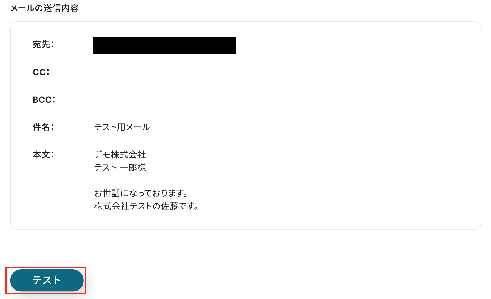 入力が完了したら、「次へ」をクリックしましょう! 次の画面で「メールの送信内容」を確認します。 ※テストをクリックすると、実際にメールが送信されるため、テスト送信しても問題ないか確認をしてくださいね。 確認後、「テスト」をクリックします。