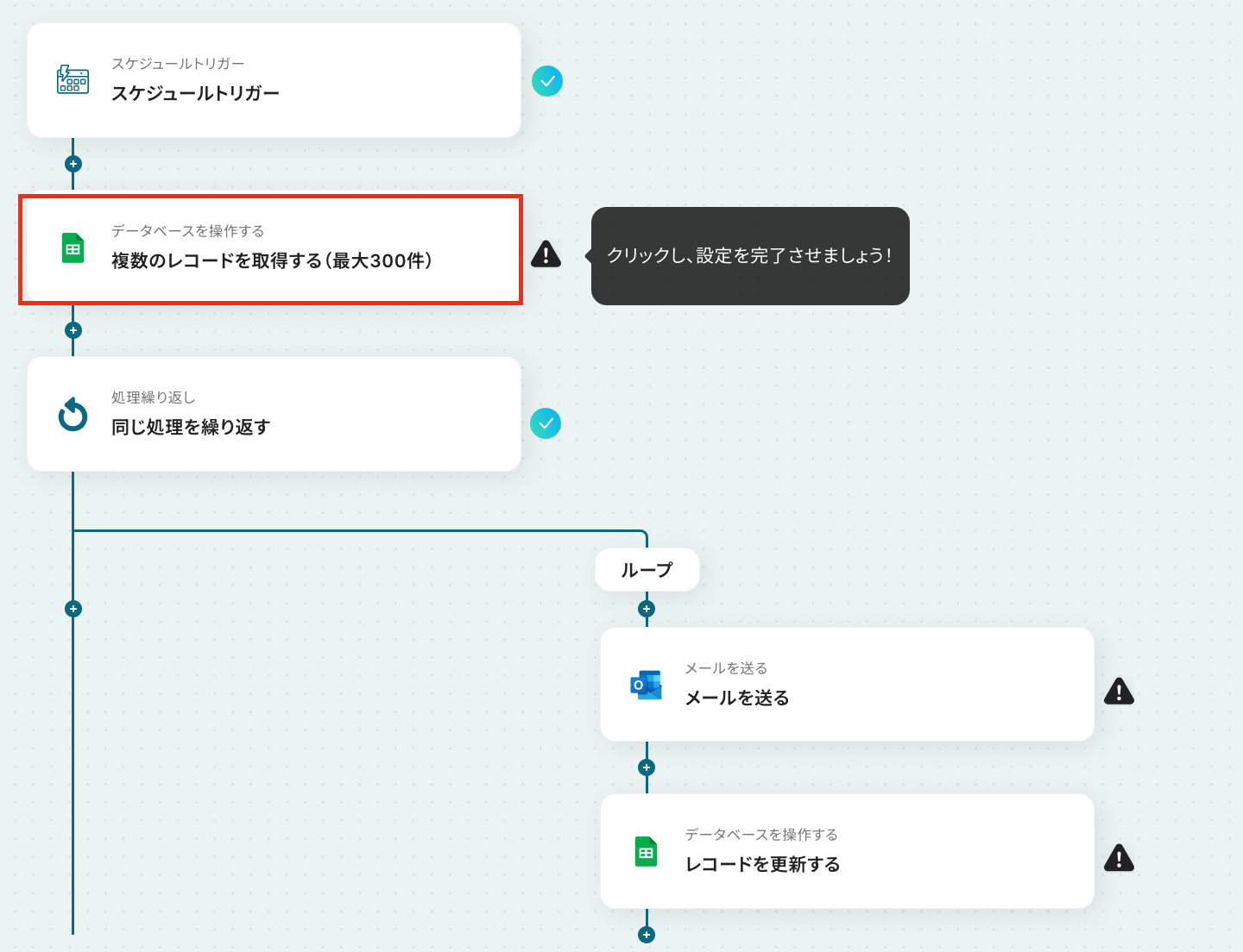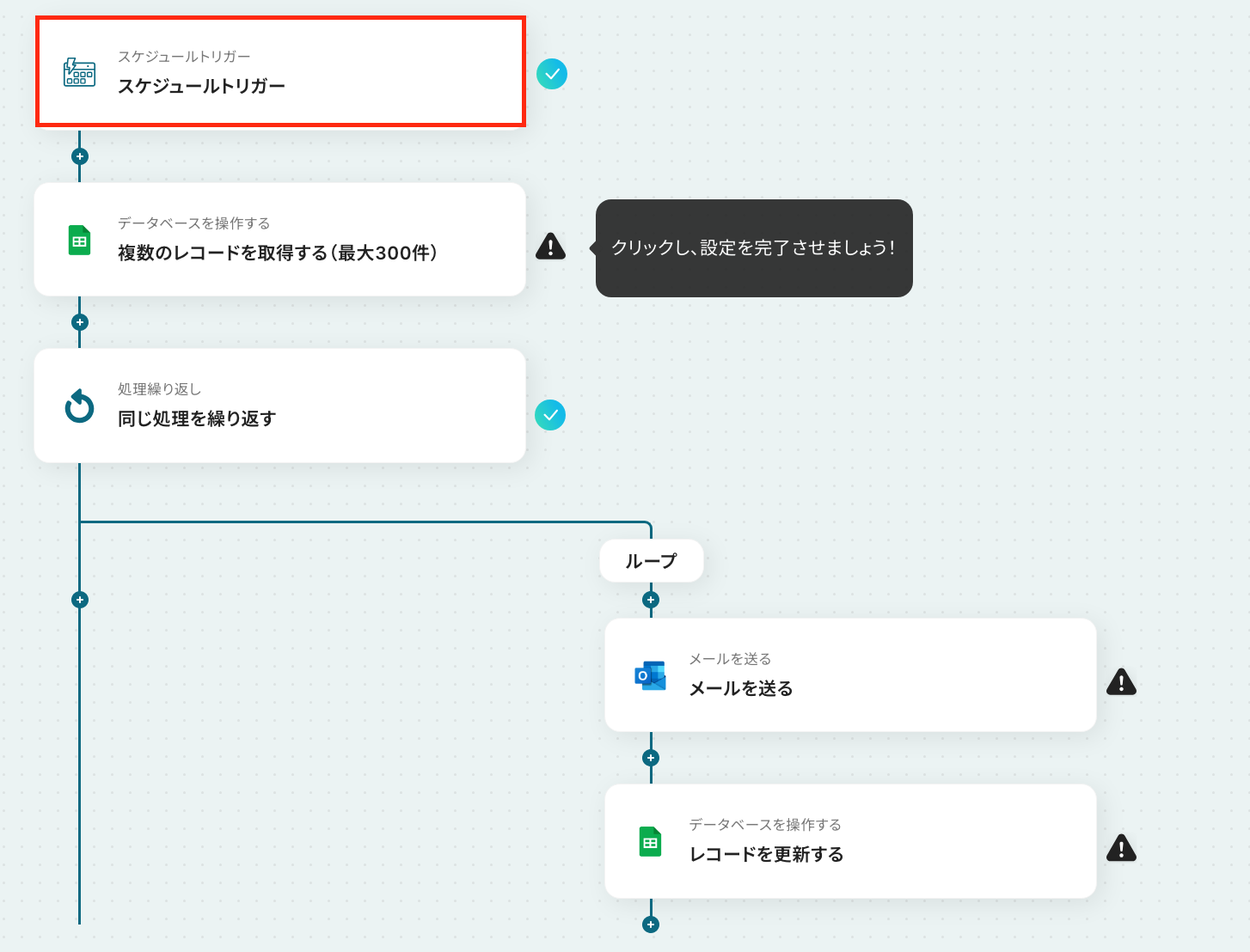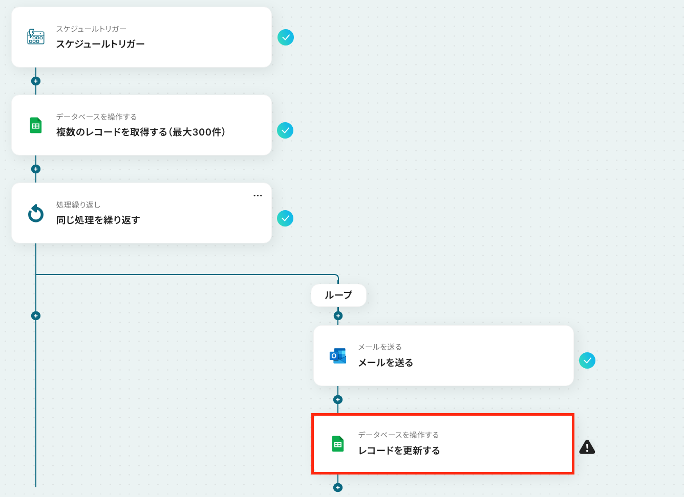 スケジュールトリガーでは、毎日、毎週、毎月など、フローボットを起動したい任意のタイミングを設定してください。 Google スプレッドシートの各アクションでは、対象としたい任意のスプレッドシートIDやシート名などを設定してください。 ループ機能では、前段のGoogle スプレッドシートで取得したレコードのリストを設定し、1件ずつ処理が実行されるようにしてください。 ■ 注意事項