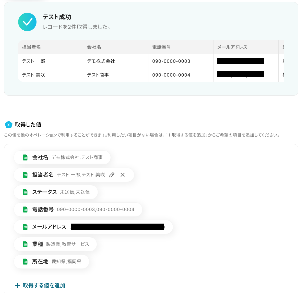 テストボタンをクリックします。 条件に合致したレコードが取得した値に表示されたことを確認しましょう! ※取得した値 とは? トリガーやオペレーション設定時に、「テスト」を実行して取得した値のことを指します。 後続のオペレーション設定時の値として利用でき、フローボットを起動する度に変動した値となります。 最後に、「完了」をクリックしましょう!
