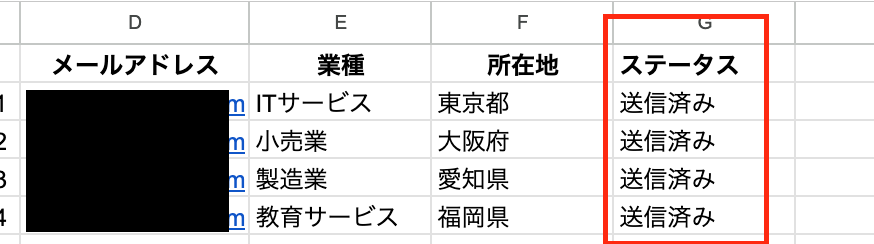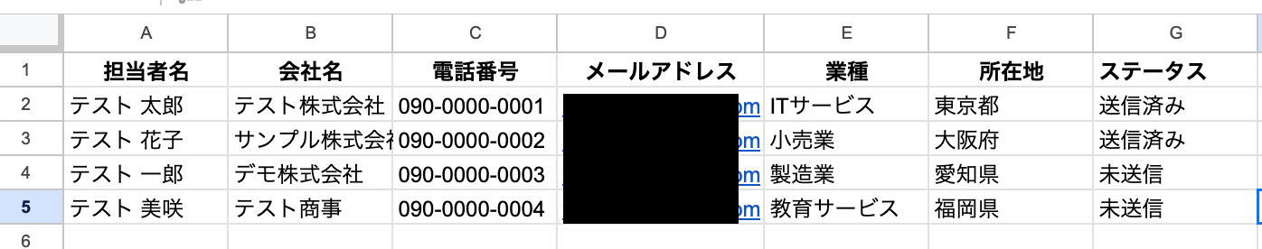 ここで、Google スプレッドシートの画面に移動し、リード情報を管理しているシートを準備してください。 シートの列内に「ステータス」を追加してください。 このように設定しておくことで、ステータスが「未送信」の行だけを取得し、メールを送信していない宛先だけに送信できます。 ※以下は、テスト用に作成したシートです。