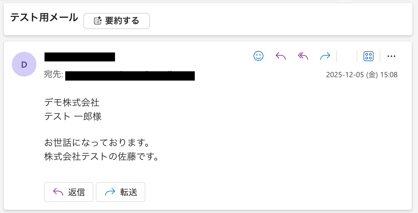 Outlookの画面に移り、指定したメールアドレスに送信されたか確認します。 ただし、ここでは「ループ変数」を用いて設定を行っているため、Google スプレッドシートの設定で取得した全てのアドレスに送信されません。 フローボット完成後にフローを起動させることで、繰り返し処理のフローが起動し、すべてのメールアドレスに送信されます。 ※以下は、「ステップ4:Google スプレッドシートの設定」で取得した一番上のレコードに記載されたアドレスに送信されたメールです。