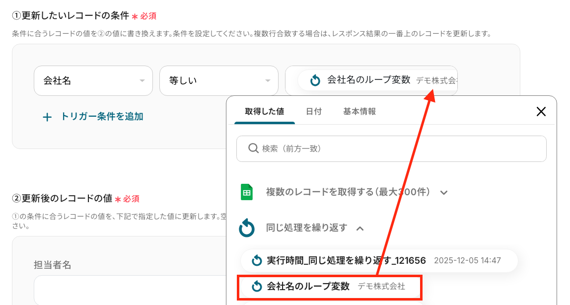 続いて、データベース操作の詳細設定画面に遷移します。 まずは、「更新したいレコードの条件」 を設定しましょう。 ここでは「会社名」が「同じ処理を繰り返す」設定で取得した値の「会社名のループ変数」と等しい場合に、レコードの値が更新するように設定しました。 ※条件の変更や追加は自由なので、運用に合わせて設定してください!