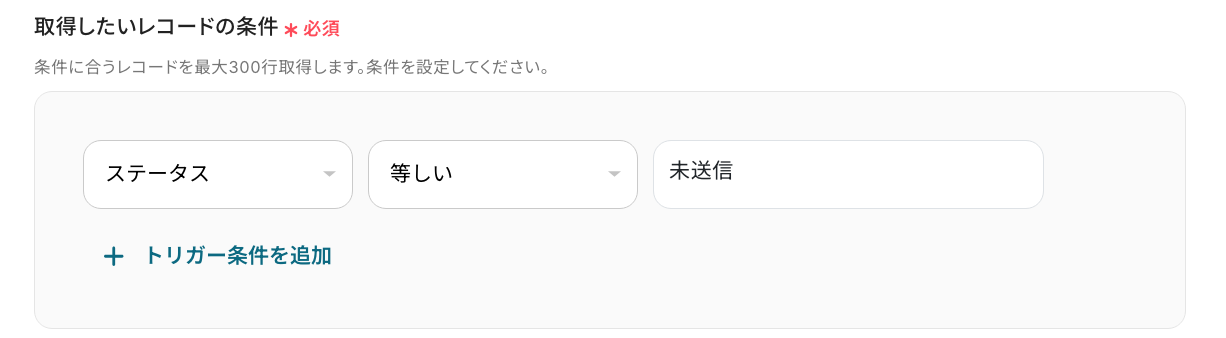次に進むと、「取得したいレコードの条件」 を設定する画面に遷移します。 今回は「ステータス」が「未送信」のレコードを取得するように設定します。