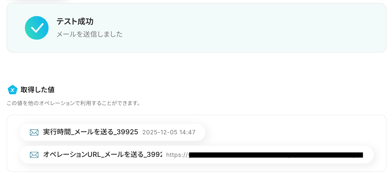 本文 :任意の文章を設定します。 コマンドオペレーション設定で取得した値を引用して設定してください。 取得した値は入力欄をクリックすると表示されます。取得した値を活用することで、固定値ではなく、トリガーが実行されるたびに最新の情報が反映できます。