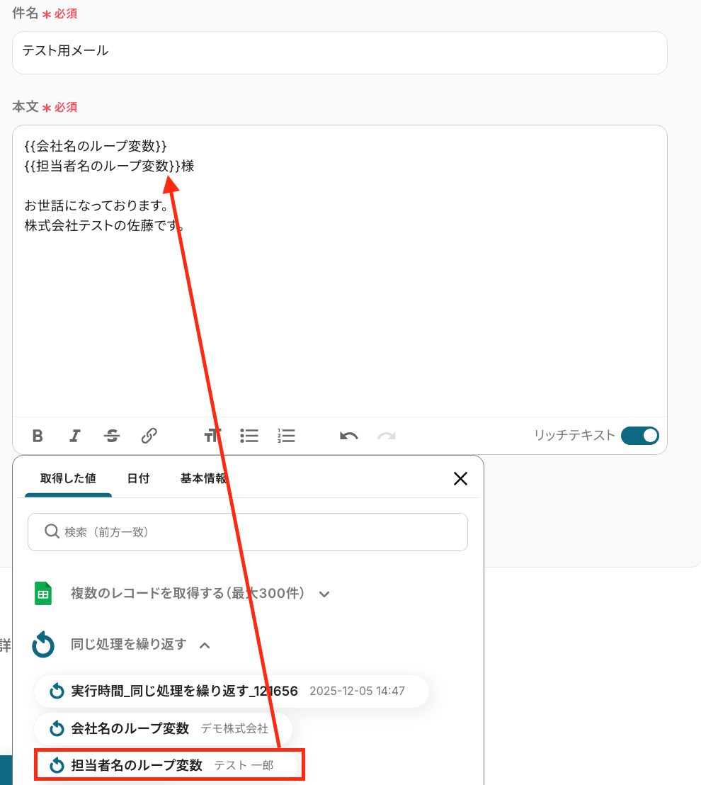 ステップ5:コマンドオペレーションの設定 ここでは、繰り返し処理の設定を行います。 同じ処理を繰り返すオペレーション(ループ処理)を用いることで、複数取得した値を繰り返し後続のオペレーションに進めることが出来ます。