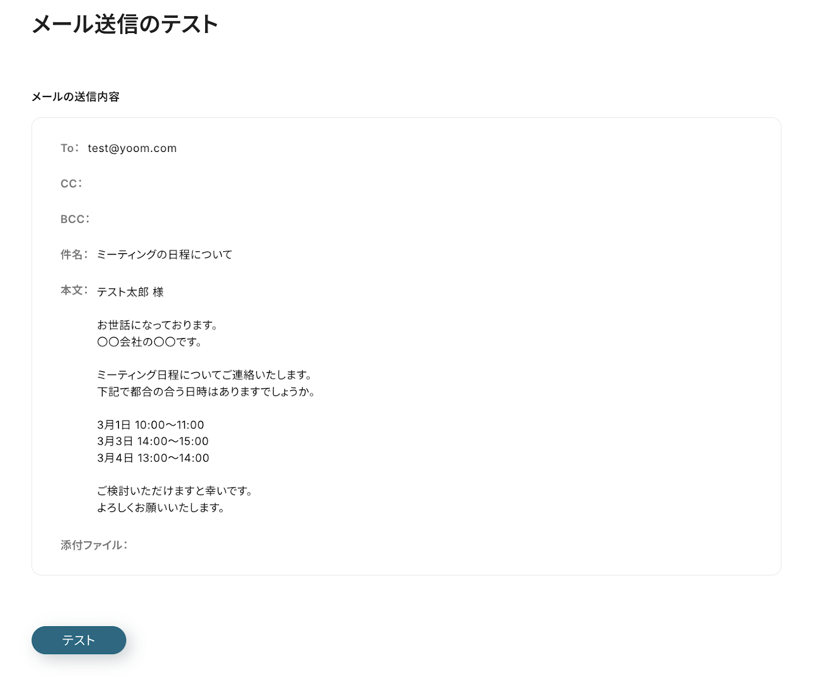 以下の画面でメールのプレビューを確認し、テスト送信してみましょう!