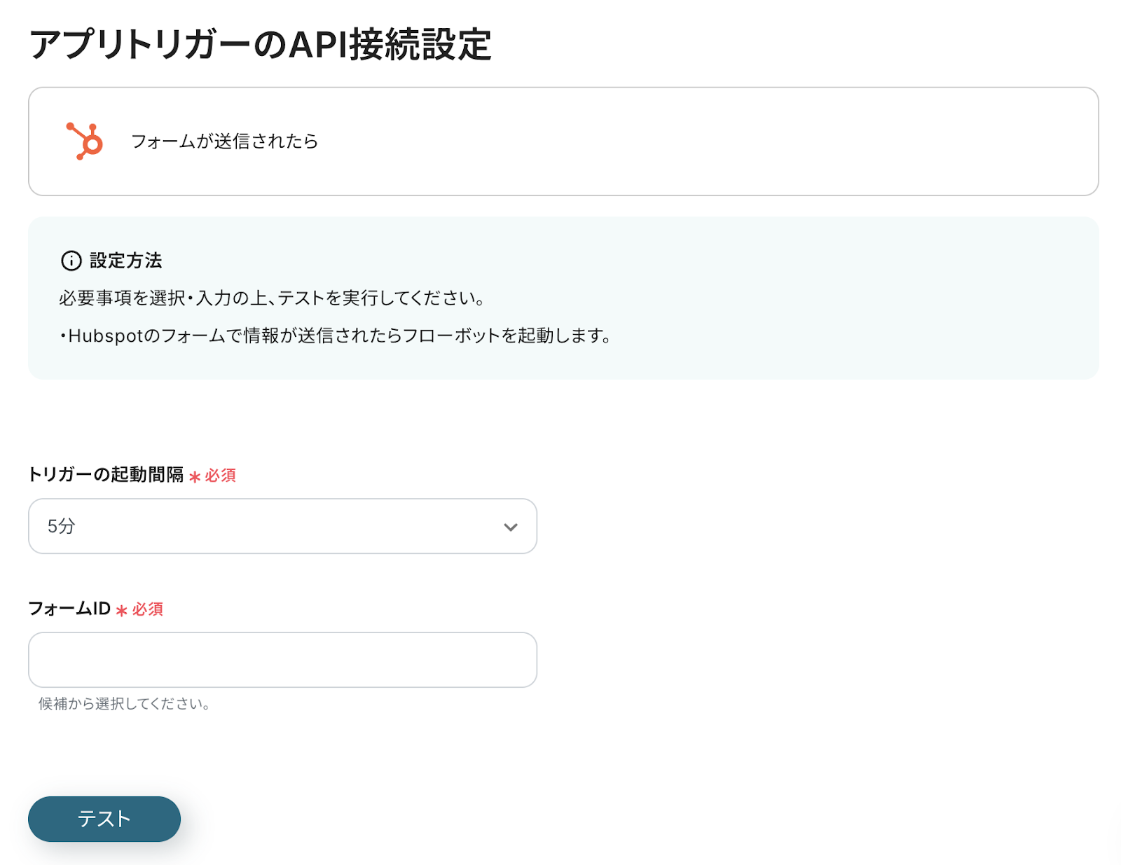 設定が完了したら、Hubspotのフォームでテスト回答を送信した後、「テスト」をクリックしてください。