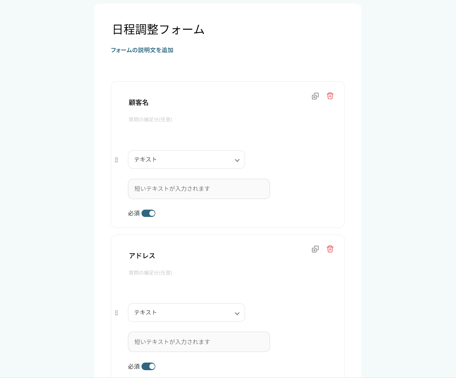 以下のフォーム作成画面では、デフォルトでフォームが作成してあります。任意でフォーム内容や設定を調整してください。