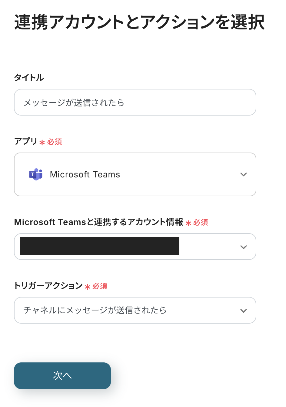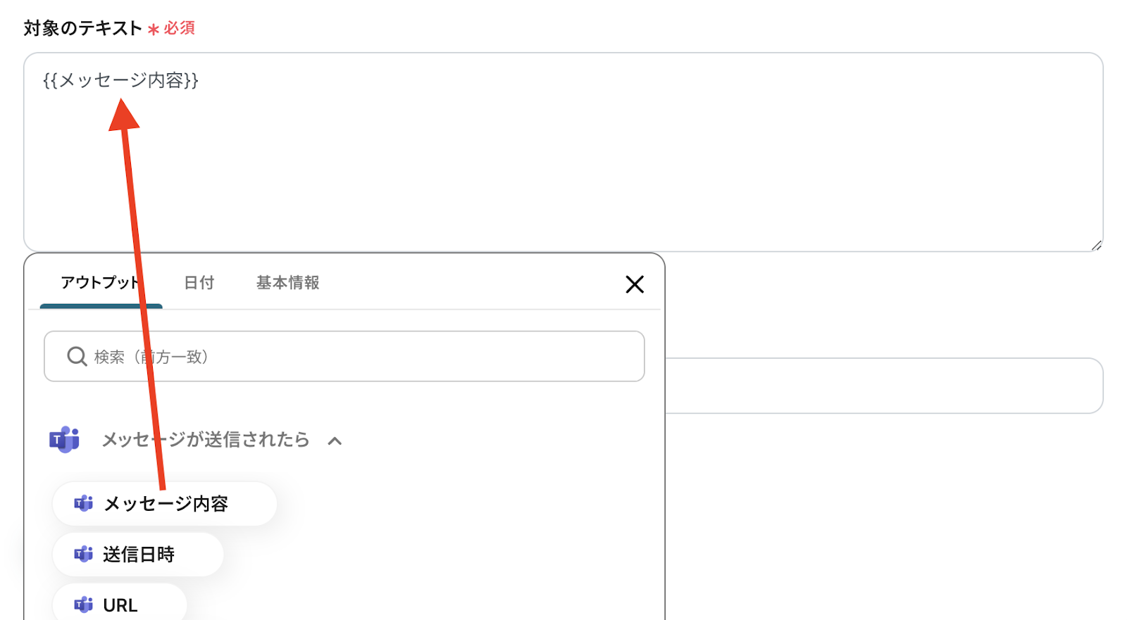 - 対象のテキスト:以下のように、Microsoft Teamsで送信されたメッセージ内容のアウトプットを設定します。