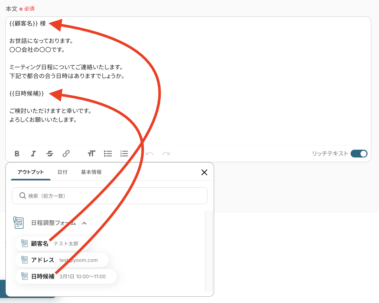 入力欄をクリックすると表示される「日程調整フォーム」のアウトプットから選択してください。