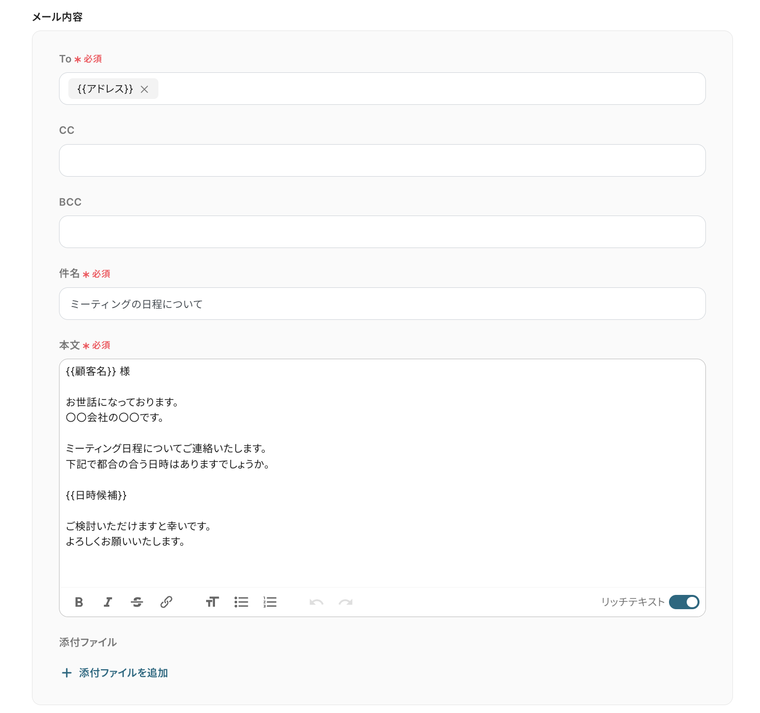 連携アカウントを確認し、以下の画面で、送信するメールの内容を設定しましょう。