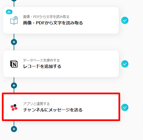 普段利用しているコミュニケーションツールをフローの最後に追加すれば、ファイルアップロードの通知を受け取れます。
