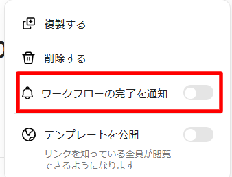 フロー設定画面右上の「…」から「ワークフローの完了を通知」をONにするだけで設定できます。