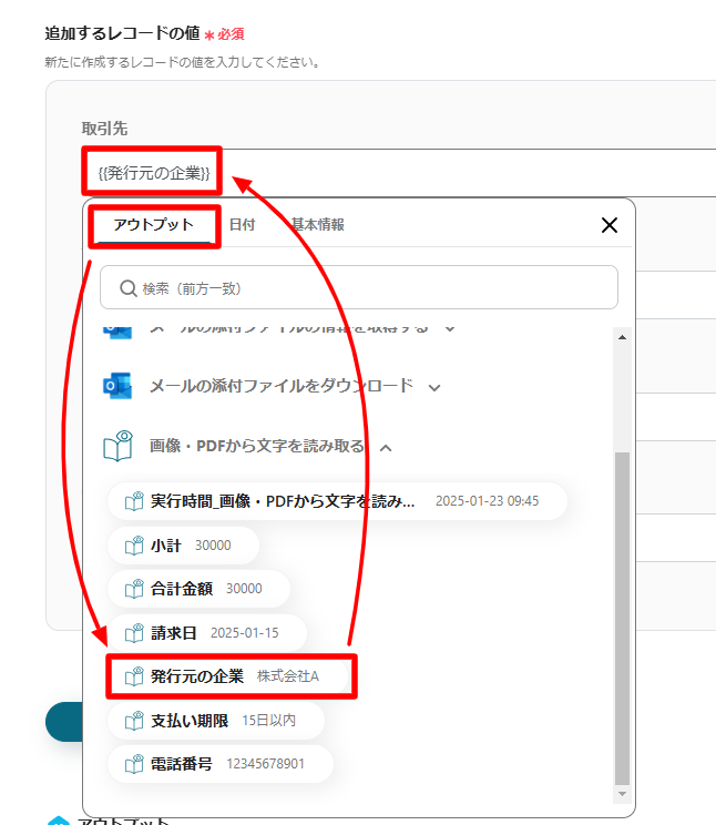 アウトプットを活用しながら、どの情報をどの項目に反映させるかを設定していきましょう。