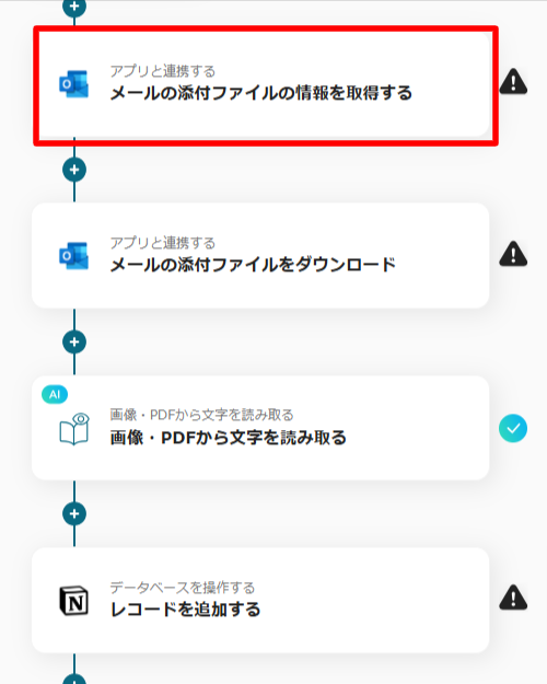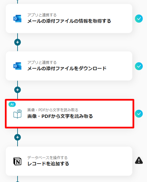 今回の添付ファイルは請求書なので上記の設定ですが、メールや履歴書・レシートなどを読み取るアクションもあるので添付ファイルの内容に応じて設定してください。