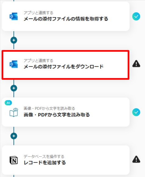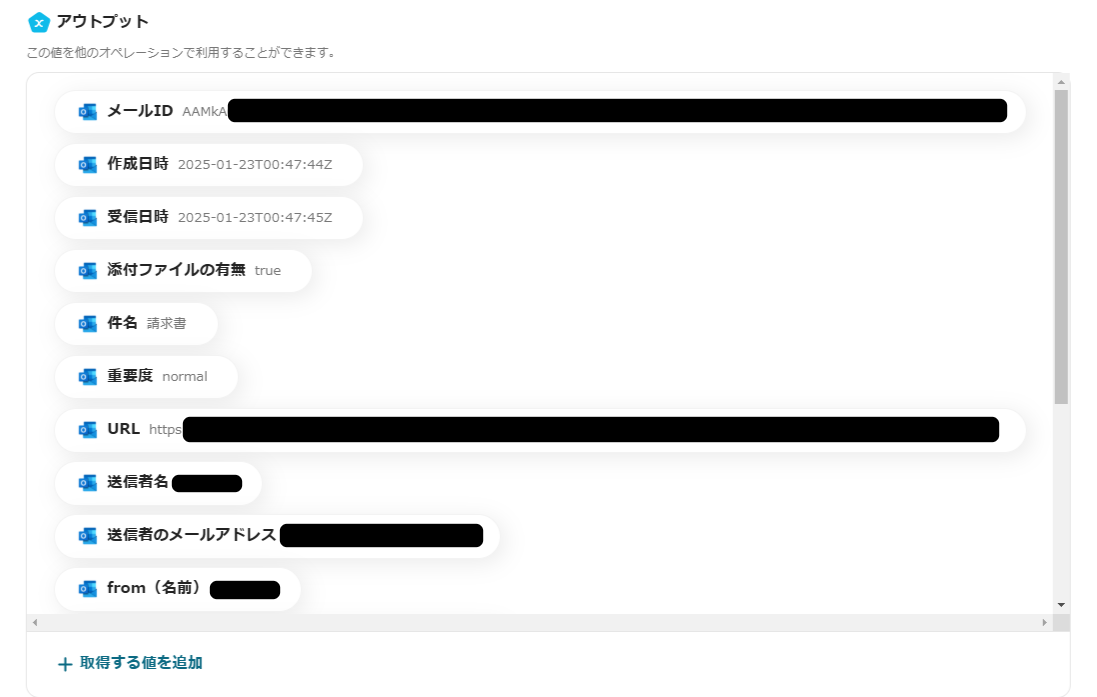 続いて「メールの添付ファイルの情報を取得する」の設定です。