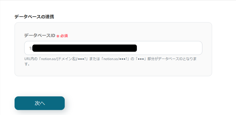 そのまま進むとデータベース連携の入力欄があるので、使用するNotionのページ情報を入力しましょう。