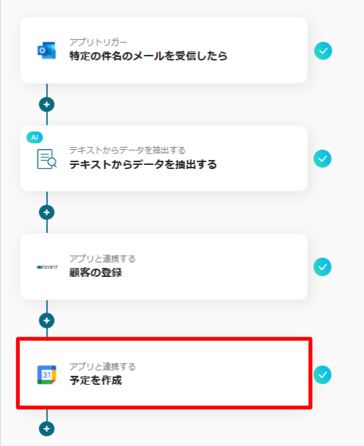 指定件名のメールが届くと、その内容から必要な情報を抽出し、自動でGoogleカレンダーに予定を登録するフローです。
