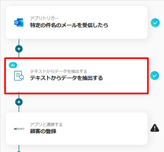 たとえば、新規事業が始まり新しい取引先が増える時期でも、メールを受信するだけで内容をAIで抽出し、必要なデータをboardの顧客情報として自動登録するフローを構築できます。