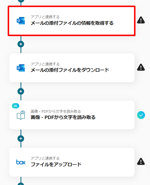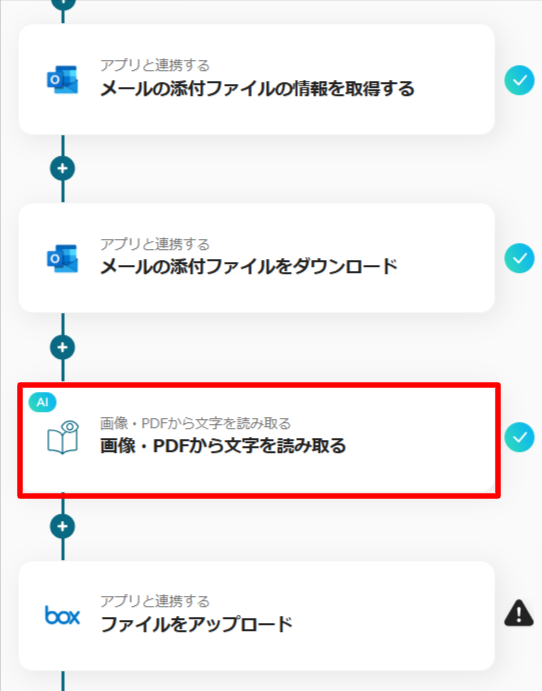 今回の添付ファイルは請求書なので上記の設定ですが、メールや履歴書・レシートなどを読み取るアクションもあるので添付ファイルの内容に応じて設定してください。
