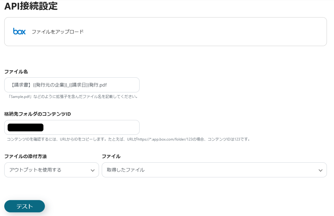 すべて入力をしたら「テスト」をクリックしてください。成功すると、Boxにファイルがアップロードされます。