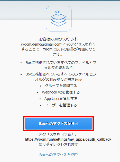 ログインができたら「Boxへのアクセスを許可」をクリックすれば、Yoomの画面に戻るのでマイアプリ連携完了です。