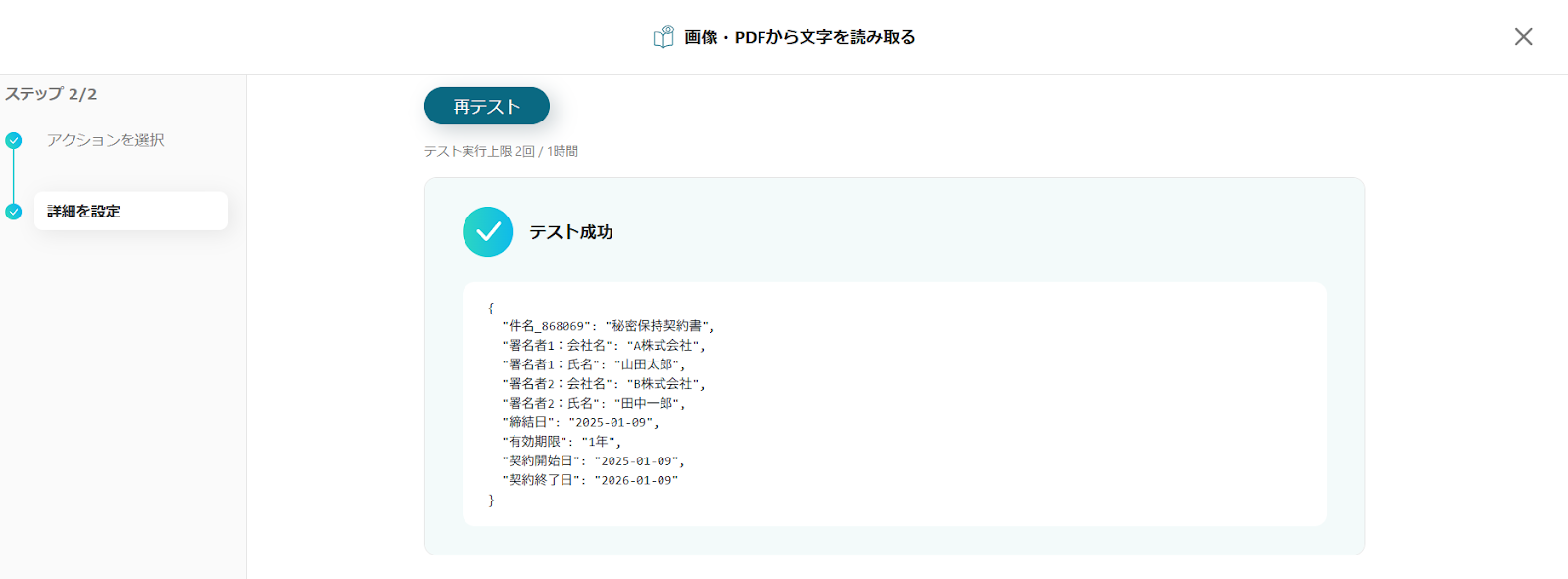 テスト成功と表示されます。これによりアップロードしたファイルのデータの読み取りが完了しました。
