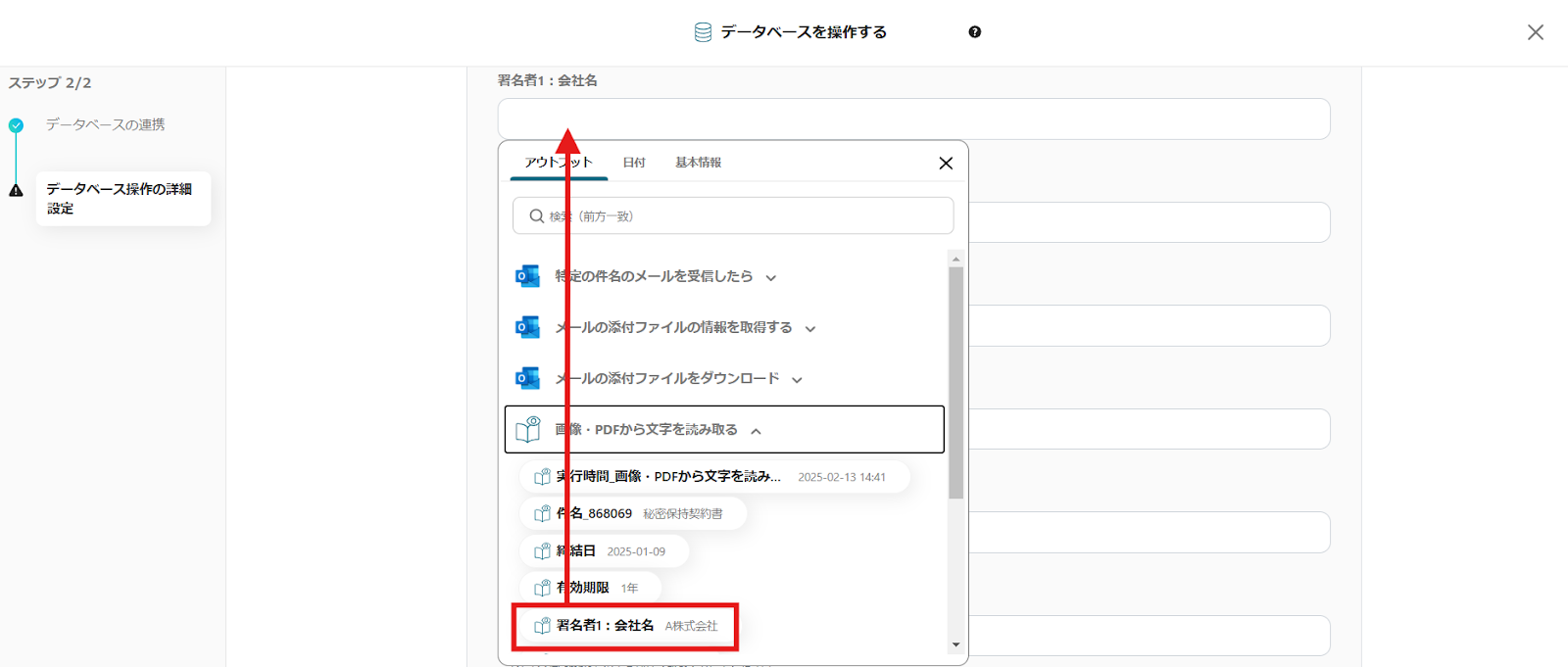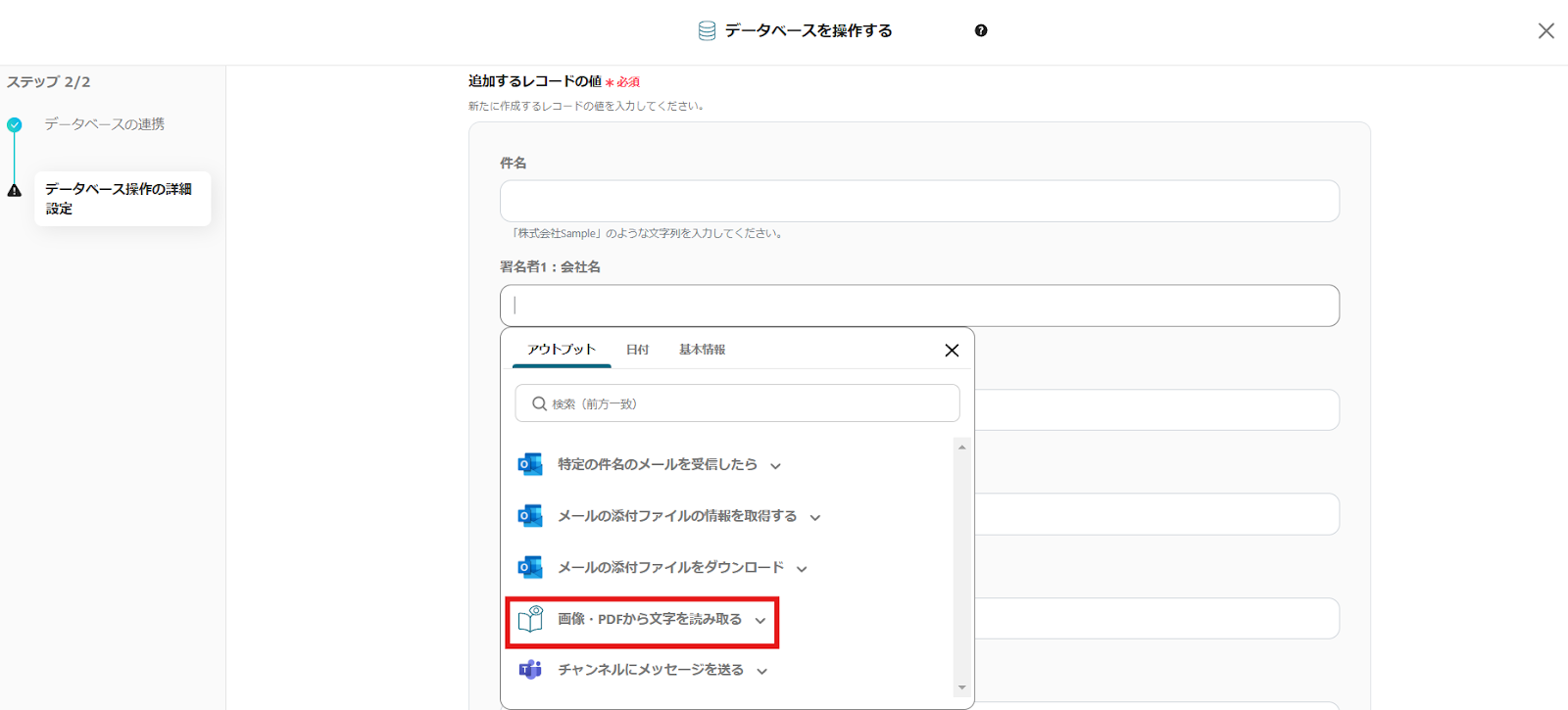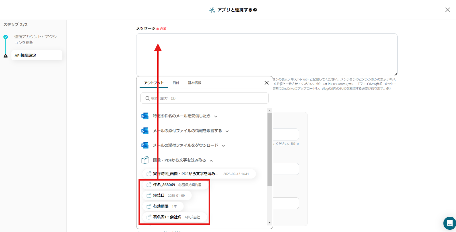 まず、指定した件名が記載されているメールデータのみOutlookのAPIを活用して取得し、添付ファイルをダウンロードします。次にファイルデータをAI-OCRで読み取り、「会社名、氏名、締結日」などの文字をデータ化することが可能です。