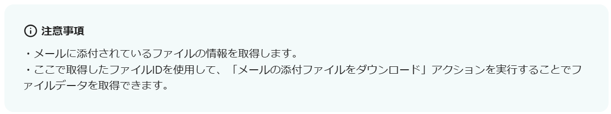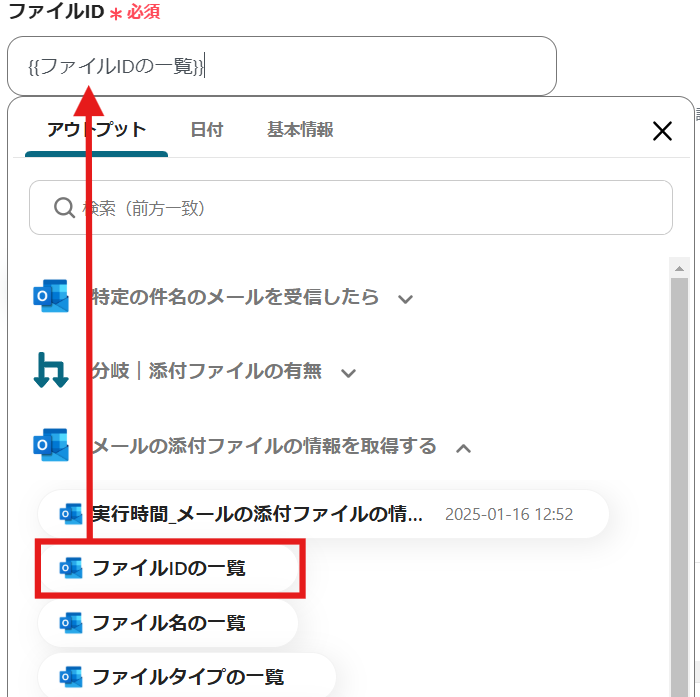 「メールの添付ファイルの情報を取得する」のアウトプットから「ファイルIDの一覧」を選択してください。