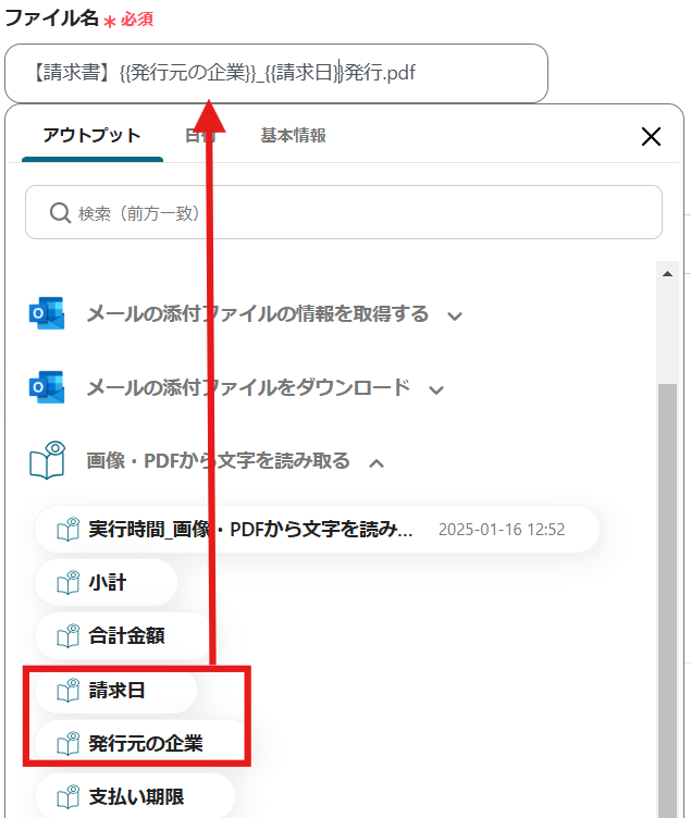 「画像・PDFから文字を読み取る」のアウトプットを活用して、ファイル名を設定することで、自動的にファイル名が更新されます。