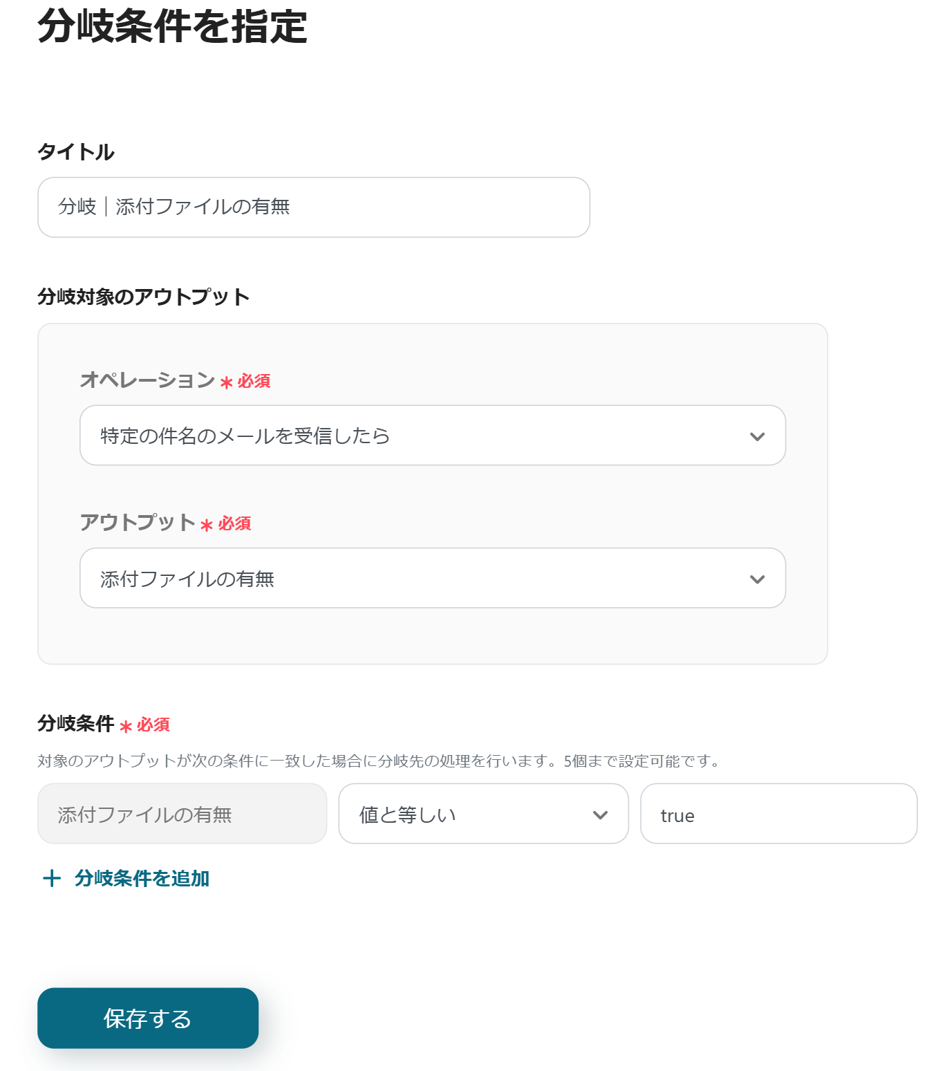 「添付ファイルの有無」、「値と等しい」、「true」