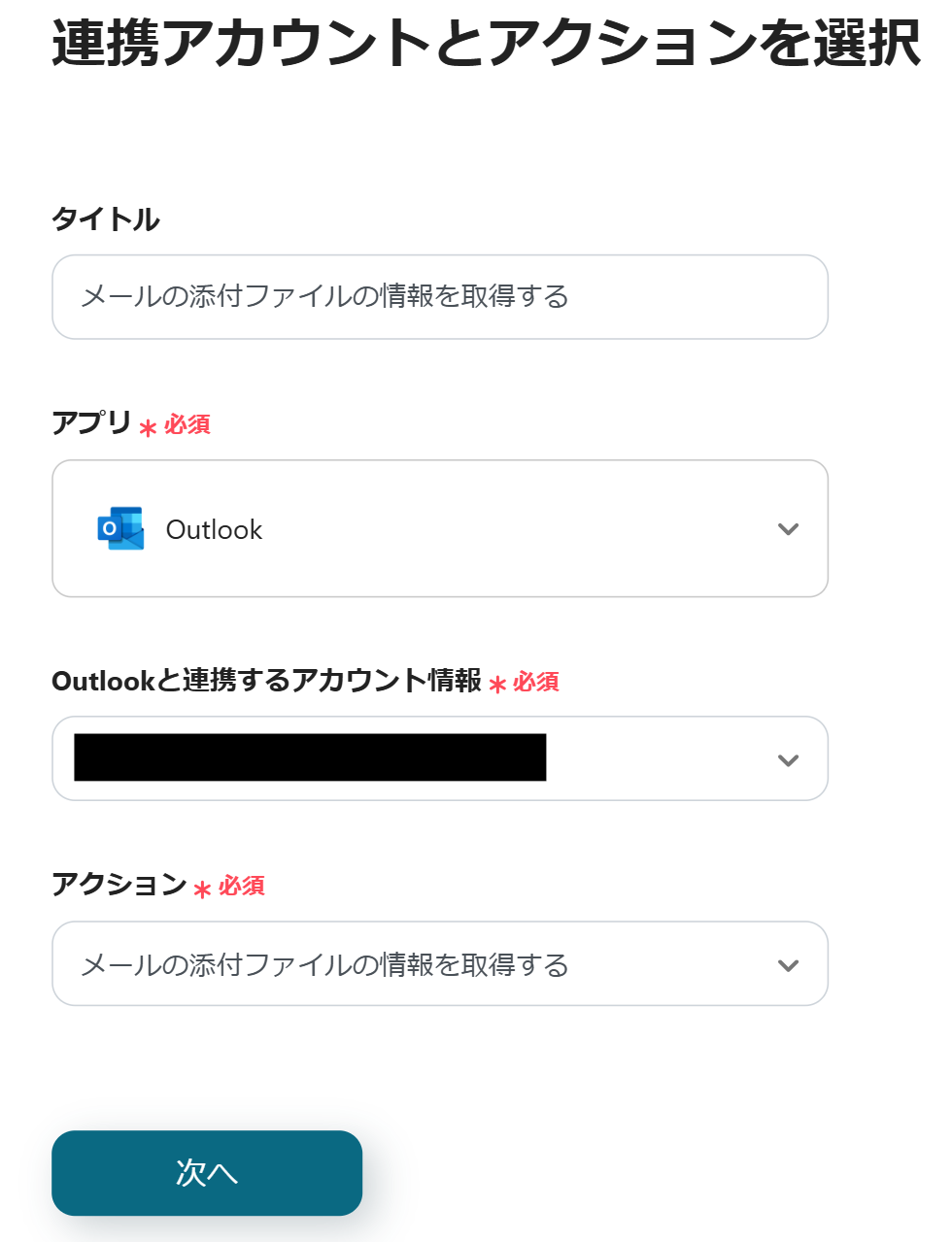 次に、Outlookでメールに添付されたファイルの情報を取得する設定を行うため、「メールの添付ファイルの情報を取得する」をクリックします。