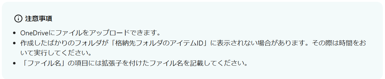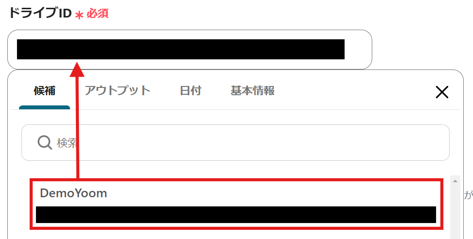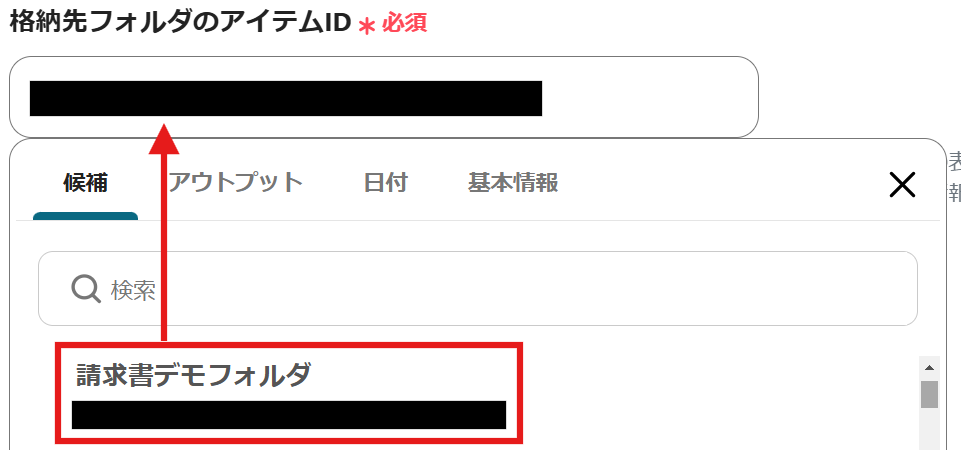 スクロールして、「格納先のフォルダのアイテムID」を候補から選択し、設定してください。