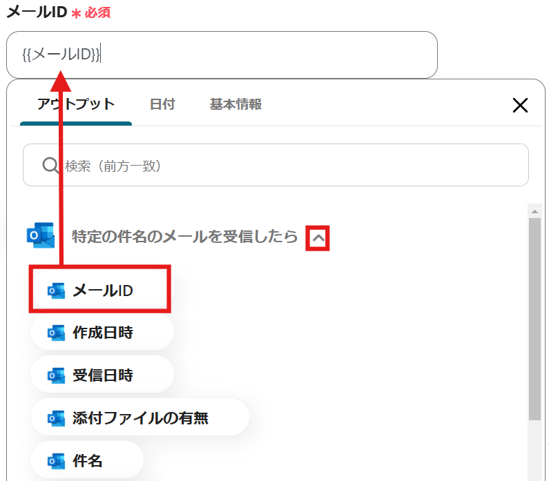 スクロールし、先ほどと同様に「特定の件名のメールを受信したら」のアウトプットから「メールID」を選択します。