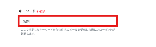 キーワード:キーワードを入力すると、件名にそのキーワードが含まれている場合にYoomのフローボットが起動します。「名刺」などわかりやすいキーワードを入力しましょう。